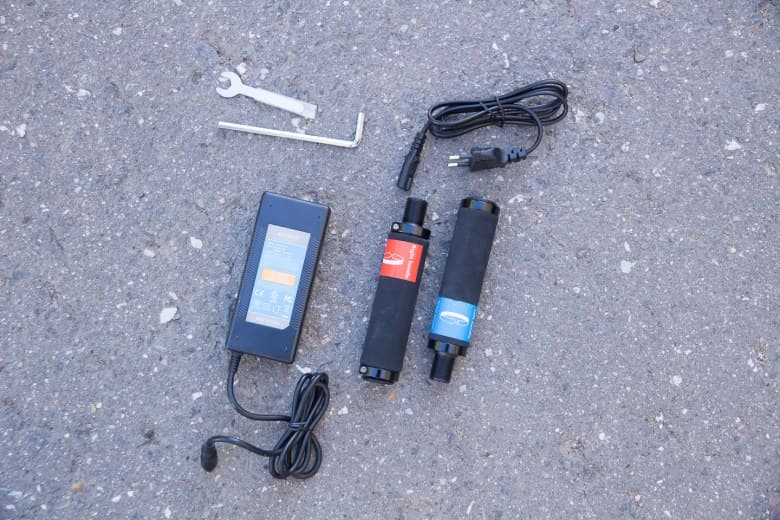 В комплекте — сам самокат, батарея, ручки, зарядное устройство с кабелем и два ключа для отстройки самоката.