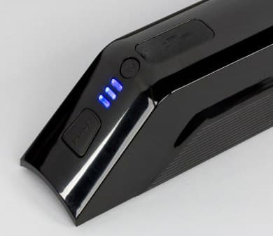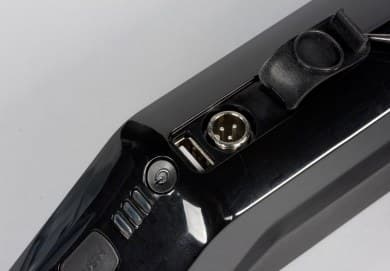 На верхней части батареи находится кнопка Push, используемая для снятия батареи с рулевой трубы, кнопка включения индикатора заряда батареи и сам индикатор. Ниже расположена резиновая заглушка, под которой спрятан USB-порт для заряда мобильных устройств и 3-контактный разъем для зарядки самой батареи.
