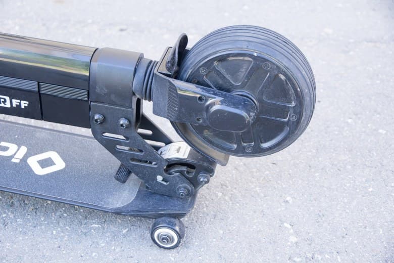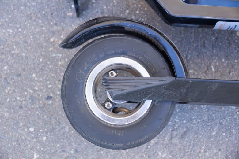 Заднее колесо — надувное, диаметром 6,5″. Чуть приспущенная камера может несколько компенсировать отсутствие заднего амортизатора. Однако во избежание травмирования заднего обода не стоит спускать камеру слишком сильно. Заднее крыло является также задним механическим тормозом: под крылом находится резиновая колодка, которая, вступая в контакт с колесом, останавливает его.