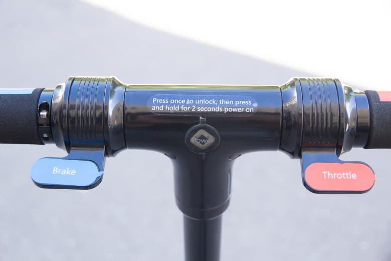 По центру руля, между рукояток, расположена кнопка включения самоката и смены скоростных режимов. В зависимости от состояния кнопка светится различными цветами: включение — фиолетовый, 1-я скорость — зеленый, 2-я скорость — синий, 3-я скорость — оранжевый. Ход кнопки небольшой, однако срабатывание весьма отчетливое.