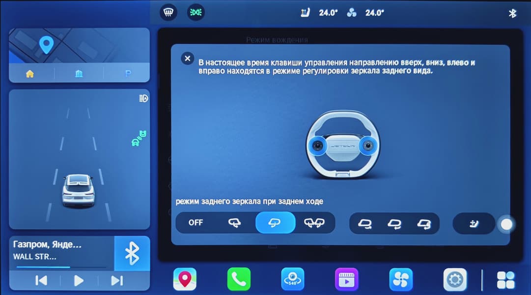 У Dashing с этим неплохо, но не идеально. Видно, что дизайнеры попытались сделать большинство кнопок-меню максимально крупными, а русификация была сделана с большим усердием, чем перевод руководства пользователя. Но, в то же время, не всегда очевидно, почему тому или иному второстепенному меню выделили столько пространства, а более часто используемую функцию спрятали глубоко внутрь с доступом по мелкой пиктограмке. Настройка зеркал — яркий тому пример.