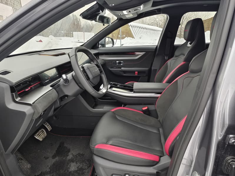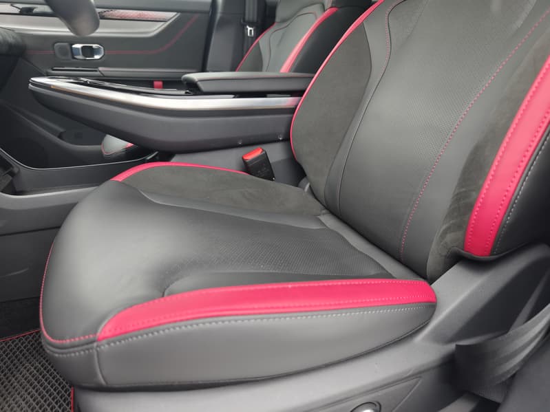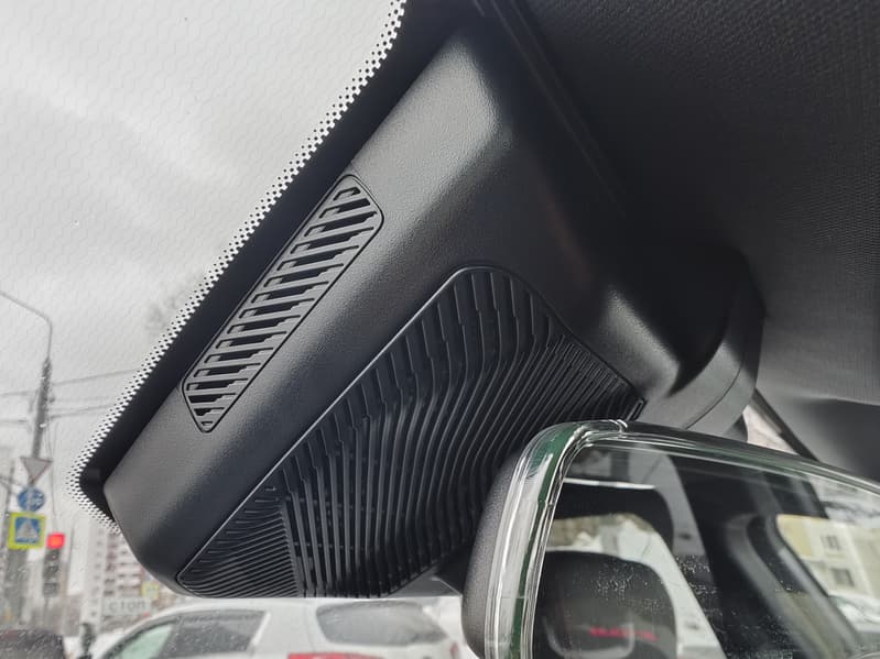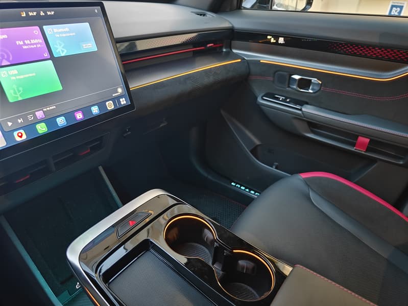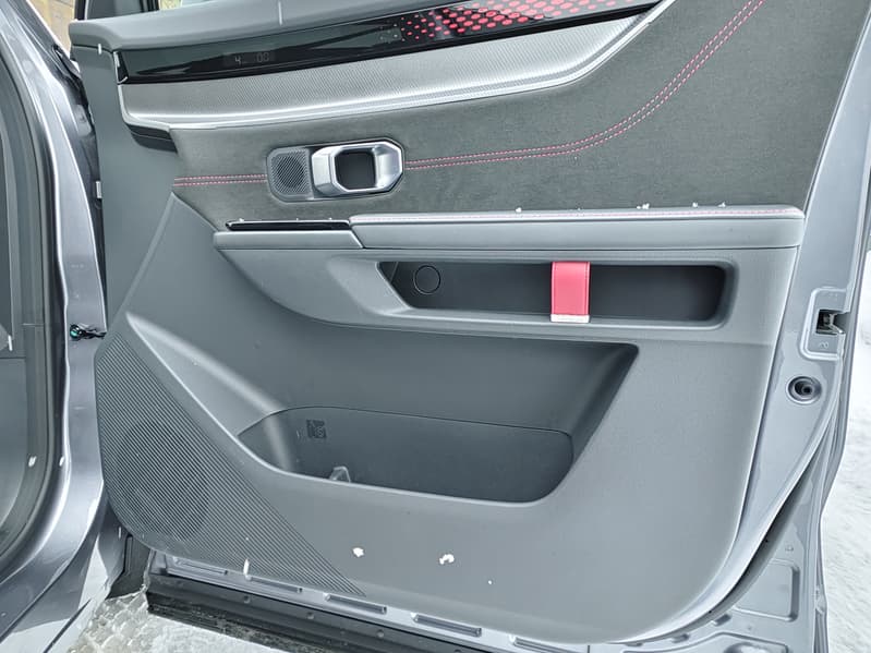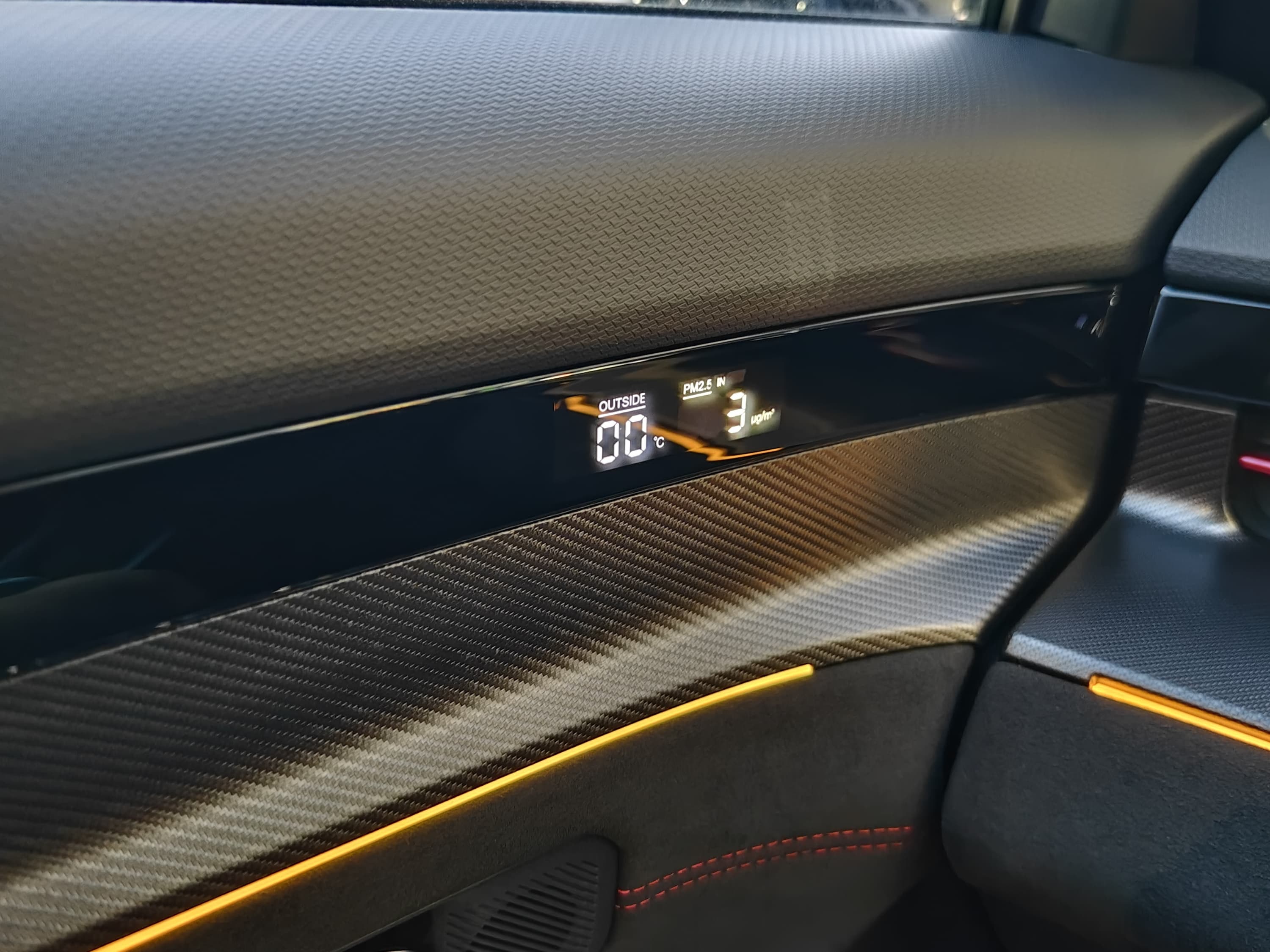 Отделка дверных карт добротная, в максимальной комплектации, как была у нас на тестировании, есть вставки из алькантары, линии подсветки и небольшие экраны, отображающие температуру за бортом и уровень загрязнения твердых частиц PM 2.5.