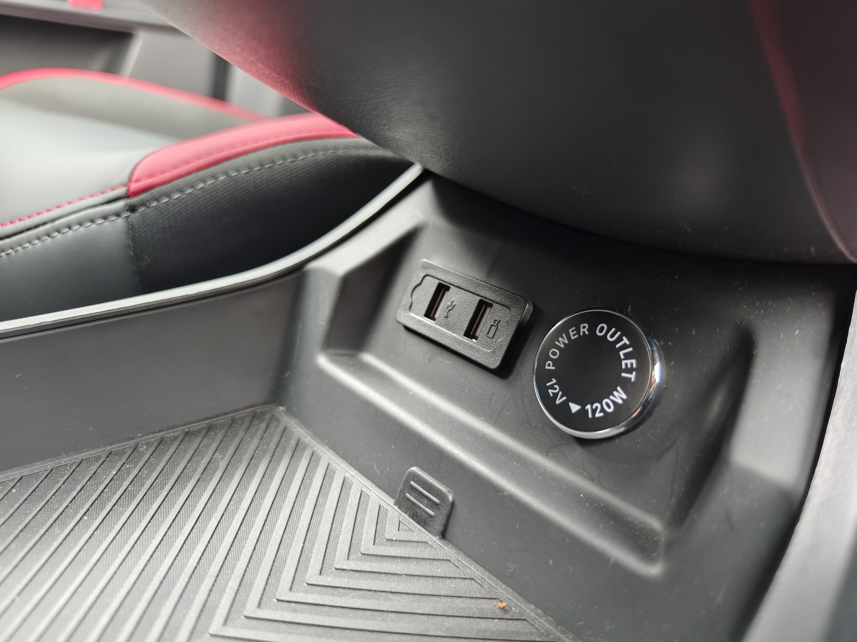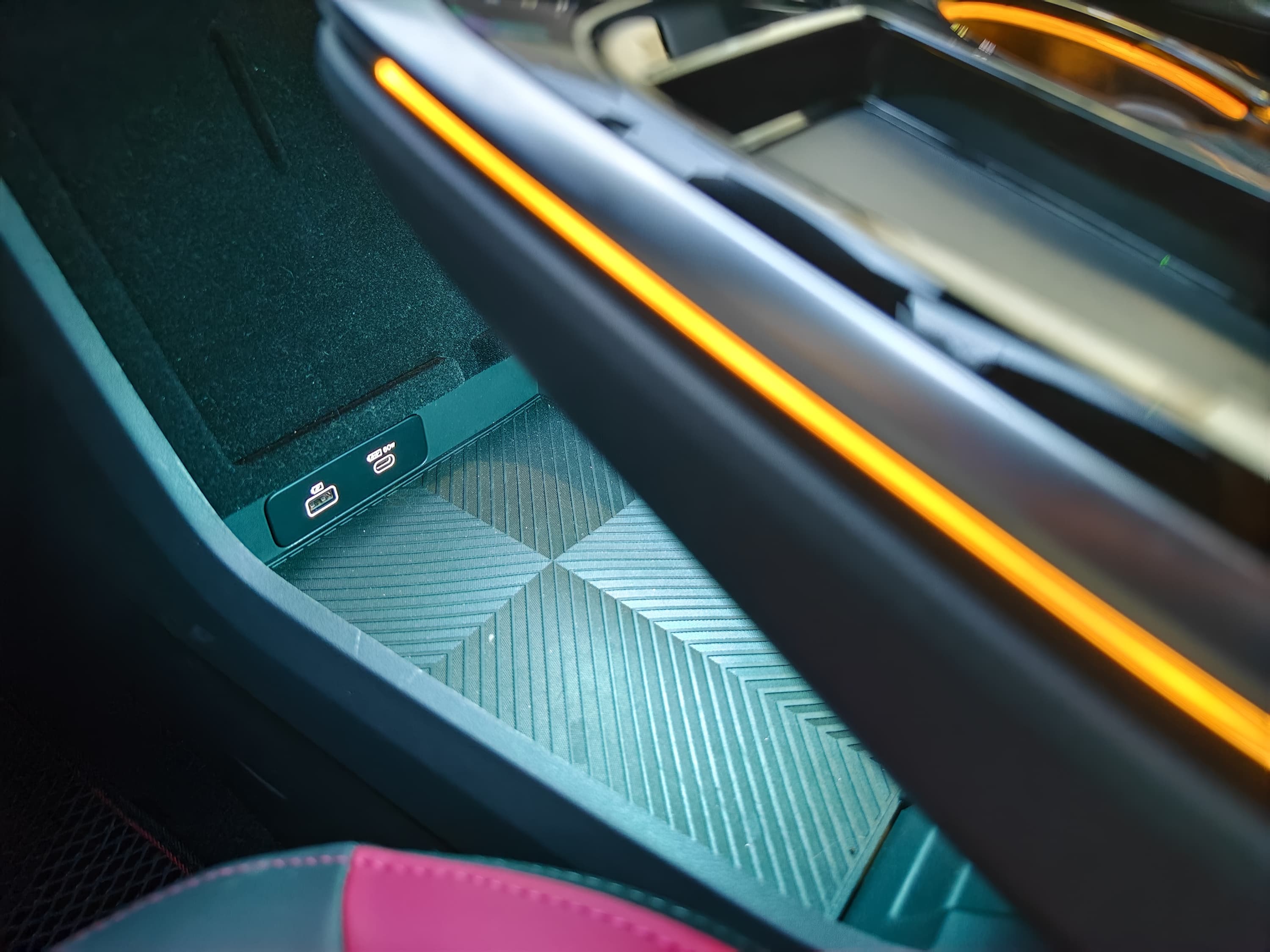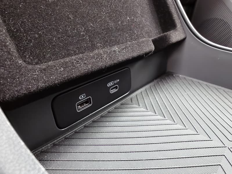 По салону разбросан широкий ассортимент стандартных розеток, включая 12-вольтовые и USB-порты, количество последних достигает четырех, из которых два выполнены в формате быстрой зарядки типа C. Для размещения смартфонов и планшетов предусмотрена просторная полка, а также удобные наклонные стойки, обитые бархатом для дополнительного удобства.