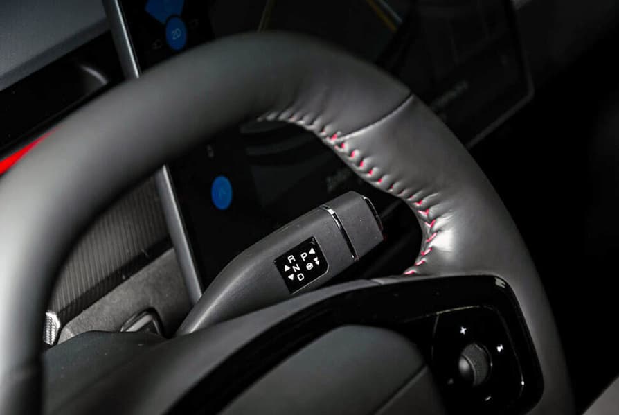 С «парящей» консоли убрали селектор выбора режимов коробки передач и все прочие шайбы-регуляторы и кнопки, которые обычно там располагаются. Включая селектор стояночного тормоза с электромеханическим приводом, который спрятали слева от рулевой колонки, ближе к ногам.