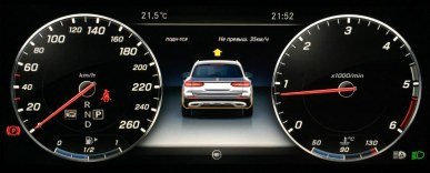 С помощью этой недешевой опции водитель сможет увидеть «парящее над капотом» виртуальное изображение размером приблизительно 21 на 7 см, содержащее важную информацию о движении. Характер выводимой информации можно настраивать. Отметим, что, на наш взгляд, наиболее полезной является информация о состоянии автопилота Distronic, скорости движения и распознанных дорожных знаках. Информация с навигационной системы выводится не совсем корректно, так, обозначения «км» и «м», характеризующие единицу оставшегося расстояния, заменяются характерными для неправильной кодировки «кракозябрами». Часть названий населенных пунктов выводится кириллицей, часть — латиницей.