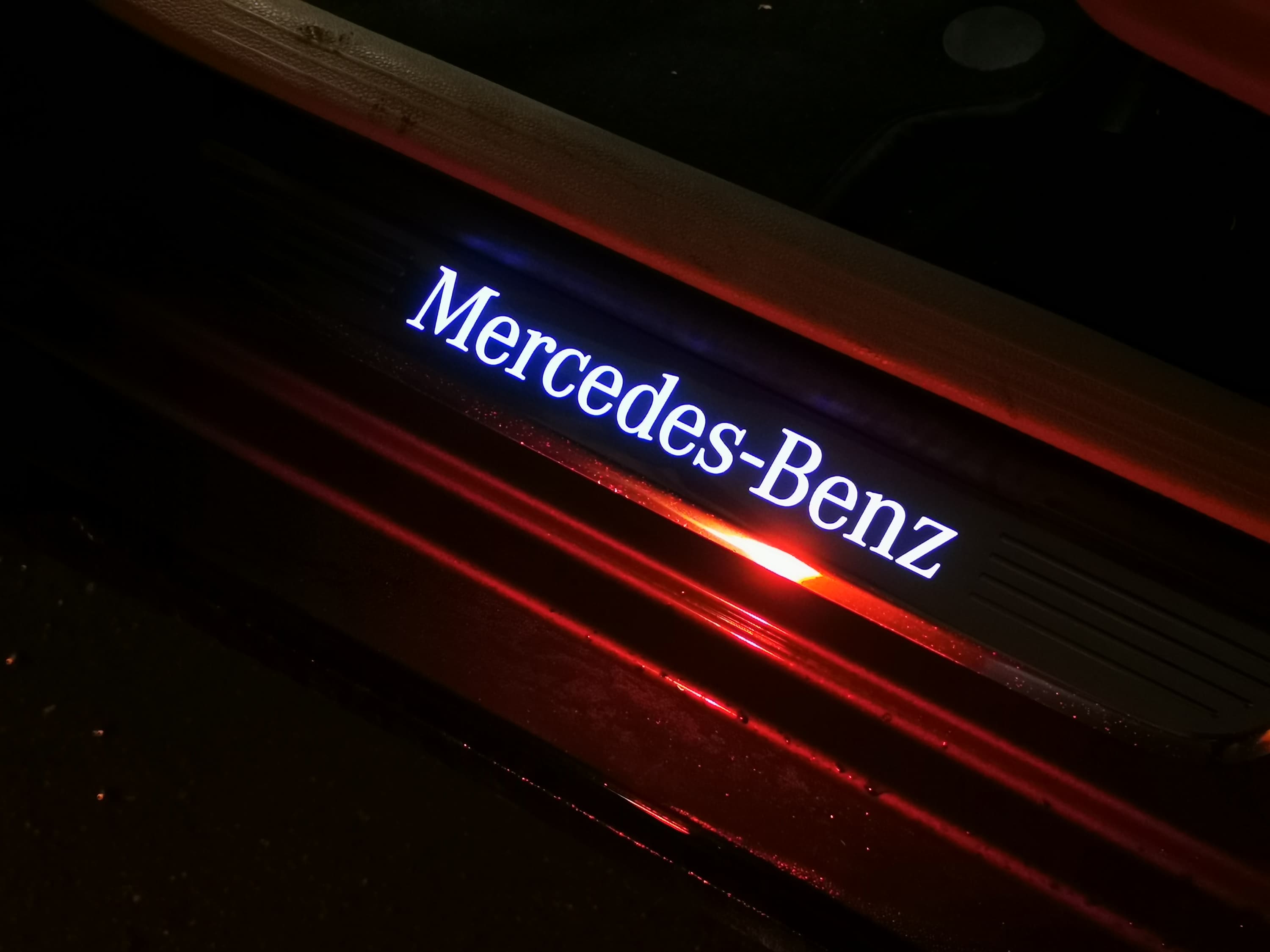 Проекции логотипа марки у нашего автомобиля не оказалось, зато подсвечиваемые пороги с надписью Mercedes-Benz — в наличии. Вот это, на наш взгляд, та опция, от которой можно отказаться, если только она уже не включена в стандартную комплектацию.