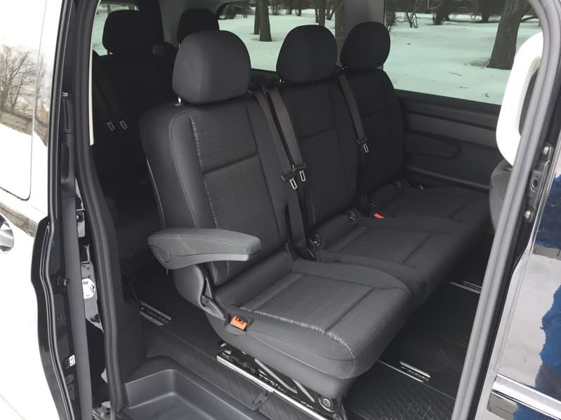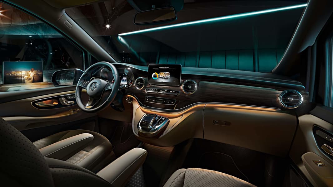 Следующее существенное отличие касается салона. V-класс следует общим традициям компоновки интерьера легковых марок Mercedes-Benz. Передняя панель, щиток приборов и оформление салона тут максимально схожи для всех автомобилей легкового класса. Водитель, пересевший, из актуальных моделей A-, B-, C-класса, а также GLC, GLE и GLS, привычно для себя найдет в V-классе и монитор-планшет, и жидкокристаллическую панель приборов. Навигация по кнопкам также не потребует специального привыкания.