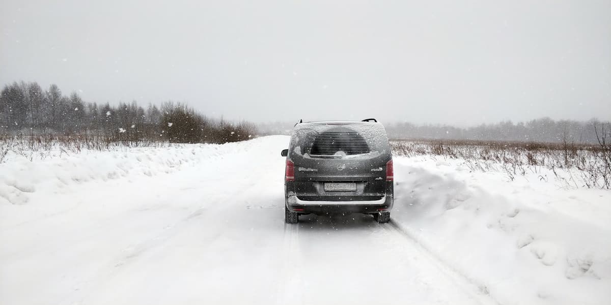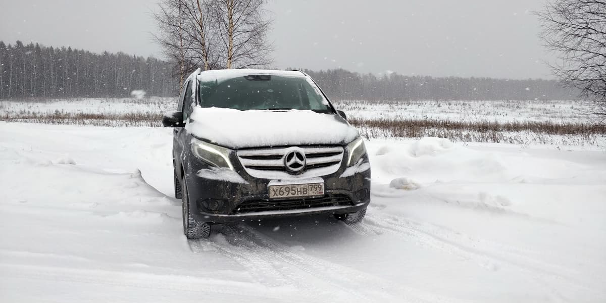 В другой день, уже без пассажиров в салоне, нам удалось испытать автомобиль на заснеженных проселочных дорогах, где Vito показал себя если не наравне с УАЗ 2206, то на уровне приличного универсала повышенной проходимости точно. Однако, при съездах с асфальтированных дорог следует учитывать тот факт, что задний свес у автомобиля длинный, а под днищем в задней части расположено запасное колесо, которое уменьшает дорожный просвет.