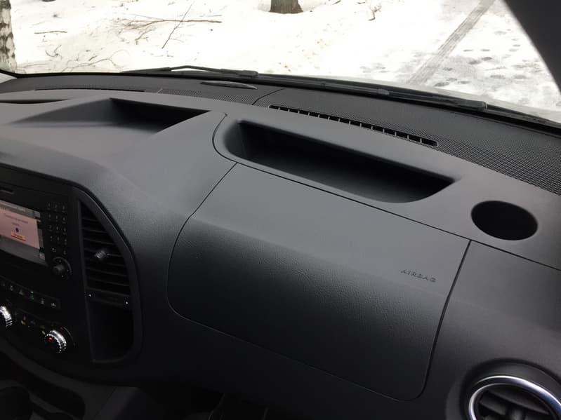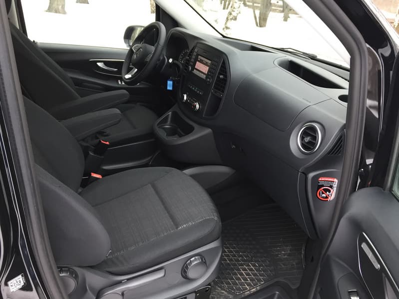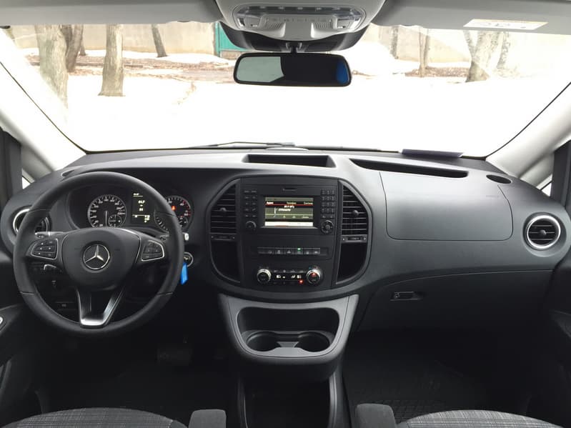 Салон Vito отсылает нас к прошлым поколениям этих автомобилей, продававшихся под брендом Viano. Он исключительно прост, местами даже, дешев. Вместо «айпада» — небольшой цветной экранчик мультимедийной системы «Mercedes Audio 15» по центру, вокруг него располагаются дефлекторы для подачи воздуха в салон и блок настройки климатической системы.