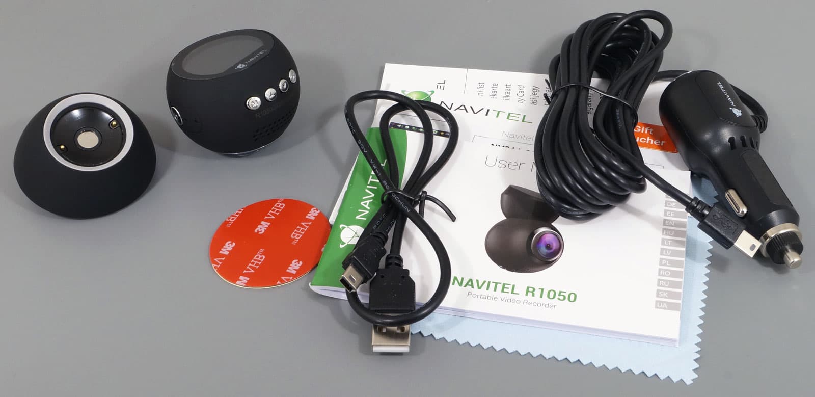 В комплекте к регистратору и его крепежной площадке прилагается запасной кружочек клейкой основы, кабель USB—Mini-USB, адаптер прикуривателя с кабелем длиной 3,5 метра, салфетка для протирки линзы и экрана, краткое руководство пользователя, а также ваучер с годовой подпиской на программу Навител Навигатор для Android с картами стран Европы, России, Белоруссии, Казахстана и Украины.