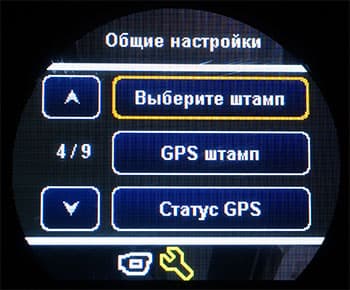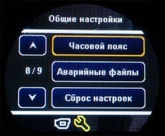 Настройки аппарата разбиты на две категории: настройки камеры и системные параметры. Общее количество настроек нельзя назвать маленьким. Например, в системных настройках оказалось аж девять страниц. Здесь есть возможность даже напечатать пользовательский текст, который будет отображаться поверх видео. Как правило, этим текстом является госномер автомобиля.