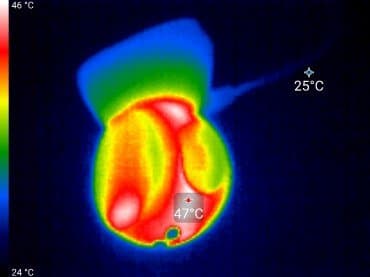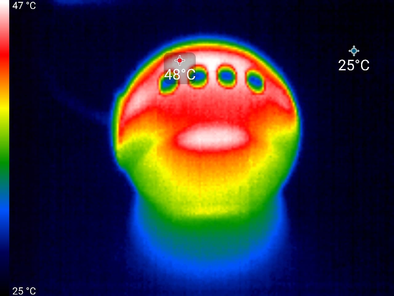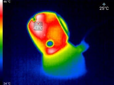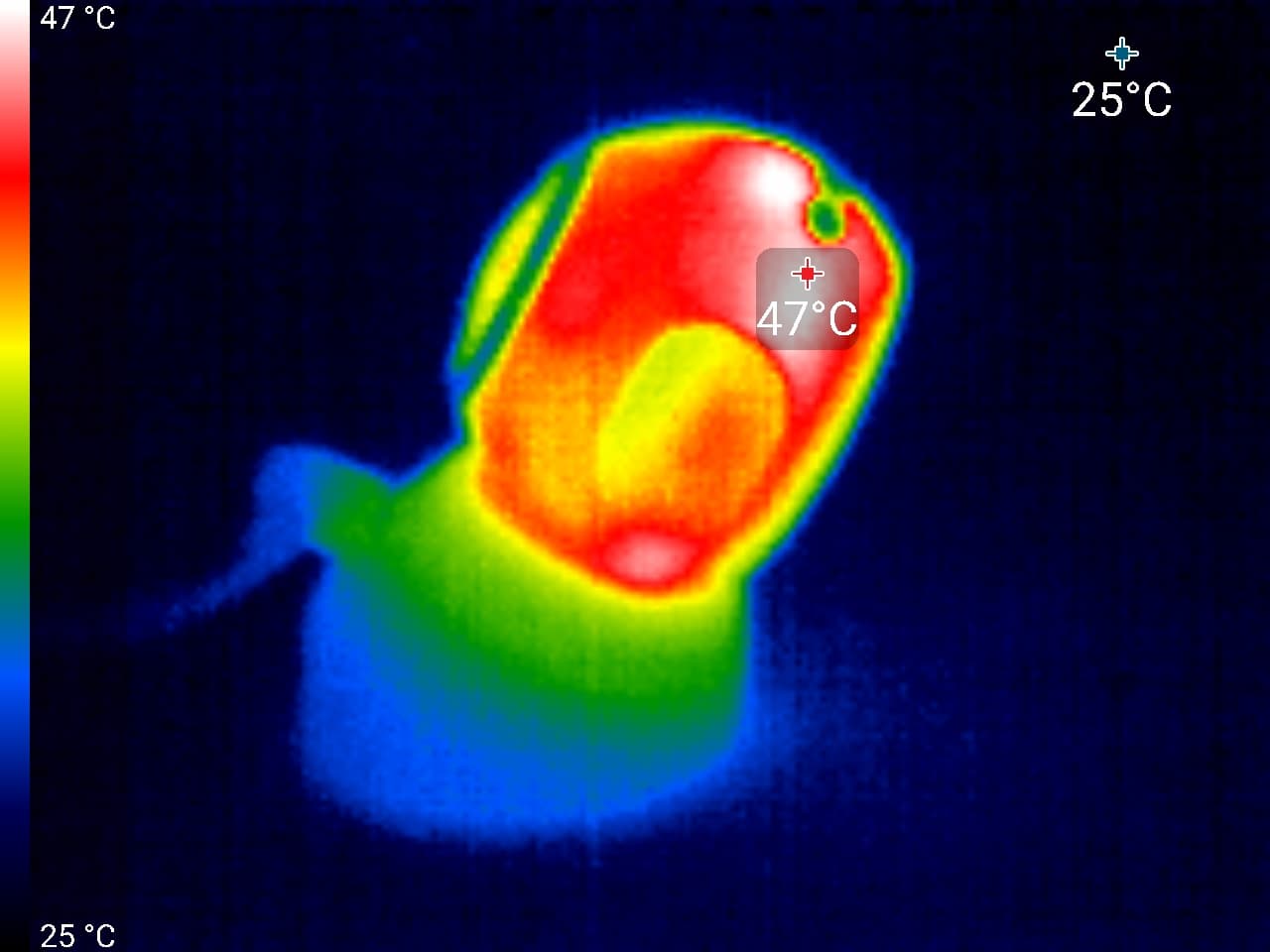Видно, что основной нагрев происходит на участке корпуса, где расположены вентиляционные отверстия. Ну что ж, логично. Максимальная температура здесь достигает 48 °C. Такая температура не несет опасности современной электронике.