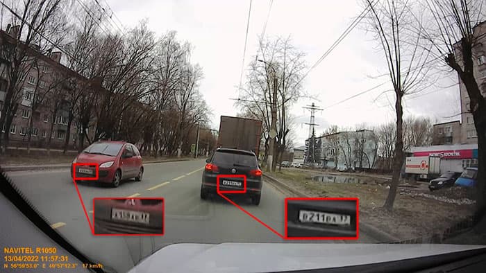 Но регистратор не снимает статику. Кодек, сжимающий видео, должен бережно сохранять движущиеся объекты. Как мы далее убедимся, справляется он с этой задачей вполне неплохо. Следующий стоп-кадр взят из видео, записанного при движении с небольшой скоростью (15-20 км/ч), а транспортные средства, чьи номера нас интересуют, либо движутся в попутном направлении.