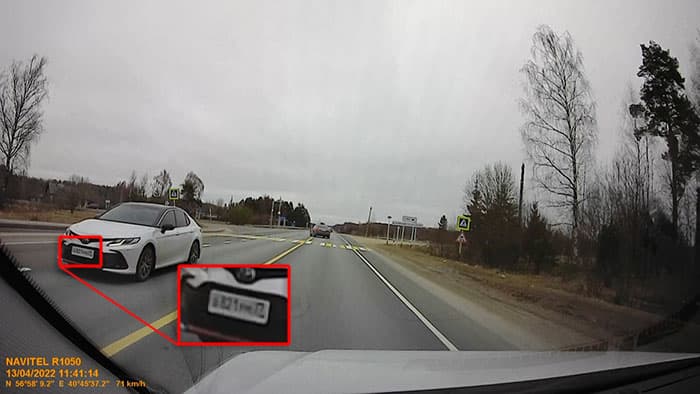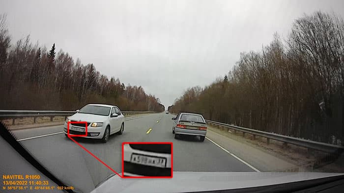 При съемке на более высокой скорости (50—80 км/ч) кодек регистратора подтверждает свою аккуратность и точность: госномера идущих навстречу авто по-прежнему фиксируются нашим прибором достаточно разборчиво. Ну, разобрать можно, по крайней мере.
