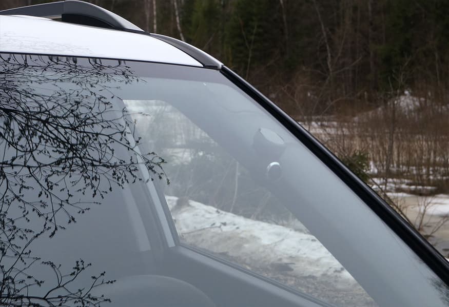 Регистратор, установленный внутри автомобиля, был бы незаметен снаружи, если бы не блестящая металлическая окантовка объектива.