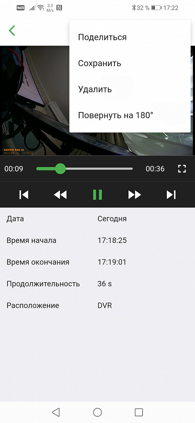 Записанные регистратором ролики можно не только просмотреть, но и отправить куда угодно, при необходимости перевернув их на 180°.