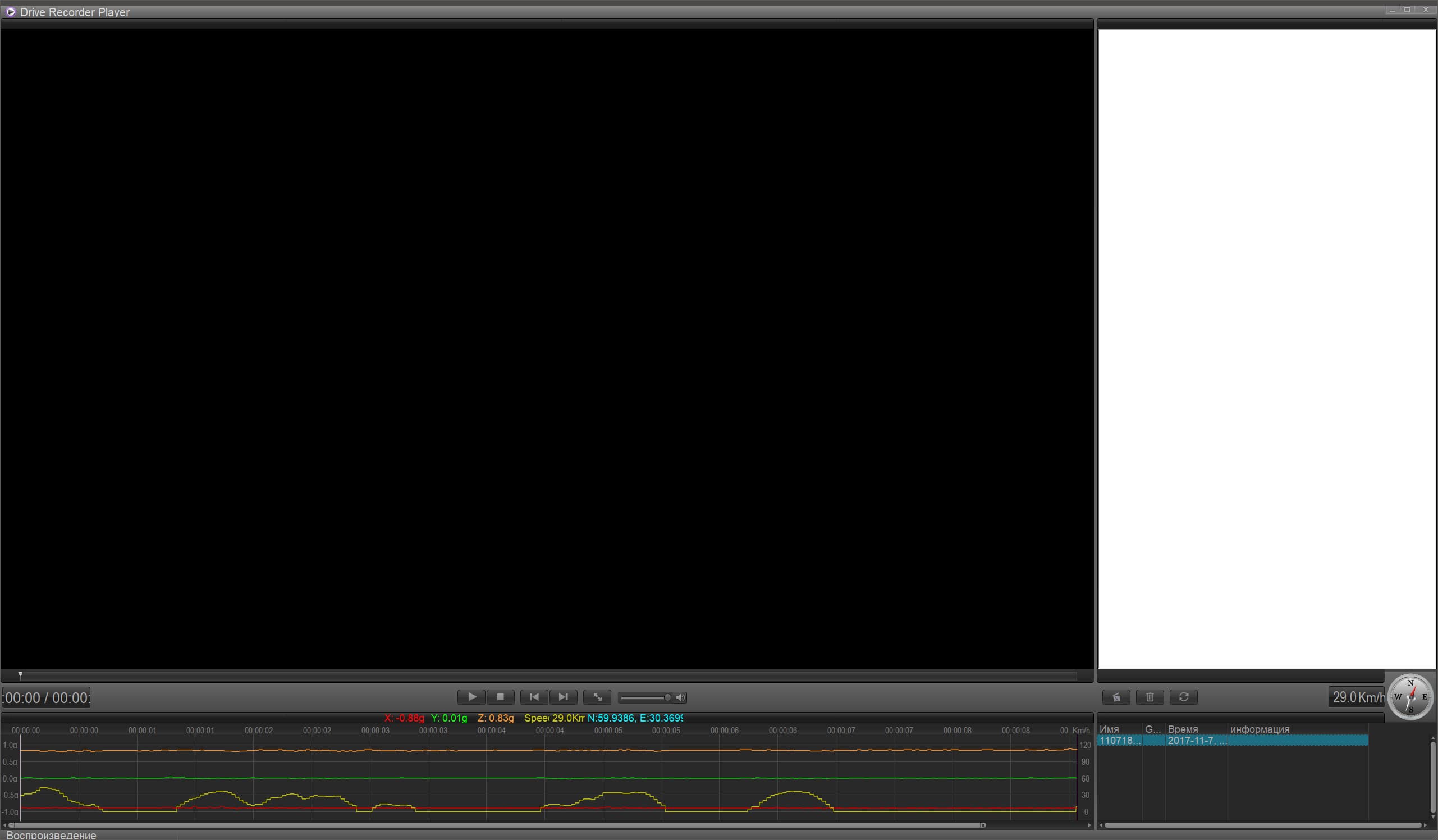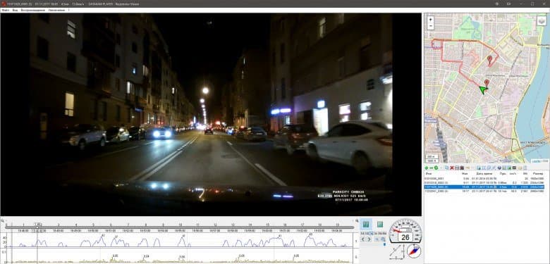 На любую корректно отформатированную SD-карточку при первой же установке в регистратор записывается файл GDRPlayerSetup.msi. Это установщик плеера под названием «Drive Recorder Player», который позволяет не только смотреть записанное видео, но и одновременно отображать маршрут на карте, выводить график показаний G-датчика — ну, в общем, все стандартно.