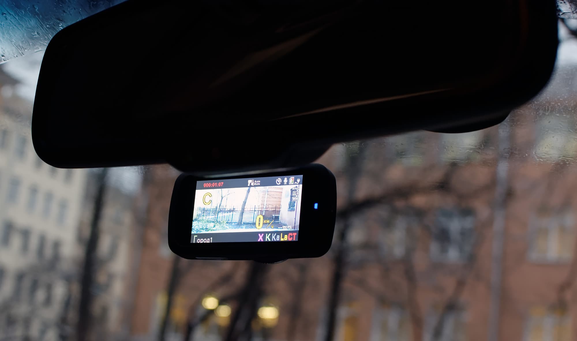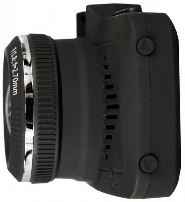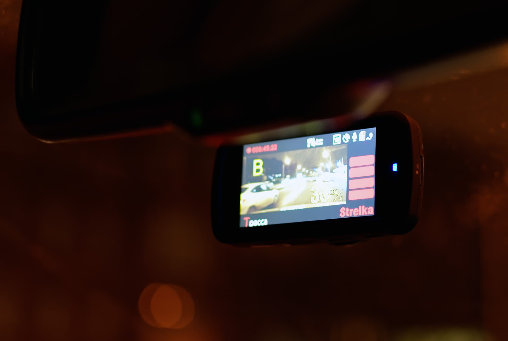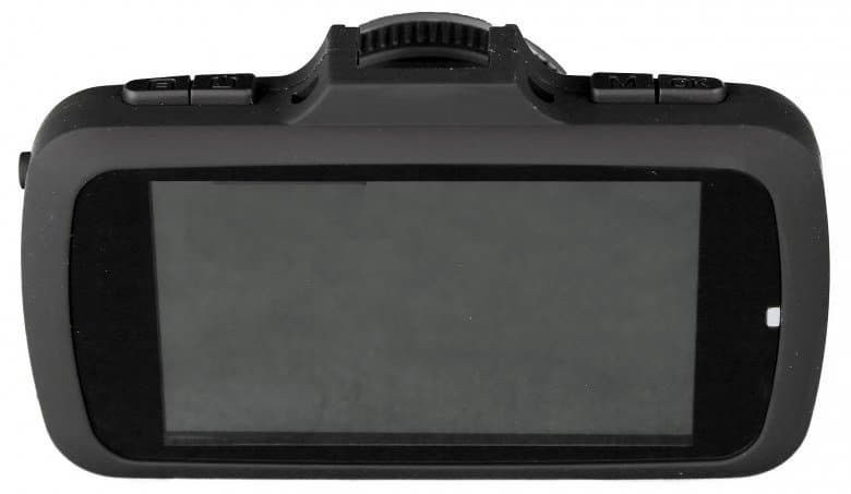 Экран, как вы можете наблюдать на фото, имеет довольно неплохие углы обзора. А вот всерьез управлять устройством, не отвлекаясь от вождения, практически нереально, т. к. для этого требуются обе руки: одна мертвой хваткой держит корпус устройства, чтобы не сбилась настройка объектива, а другая — давит на тугие клавиши, которые для водителя к тому же еще и не всегда удобно расположены.