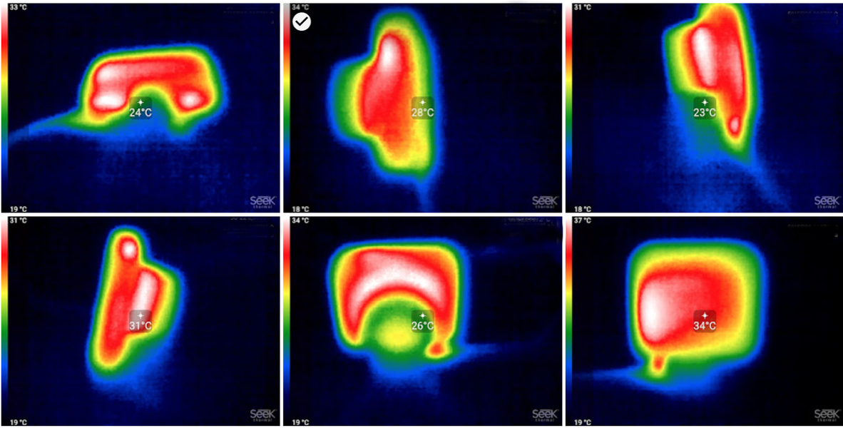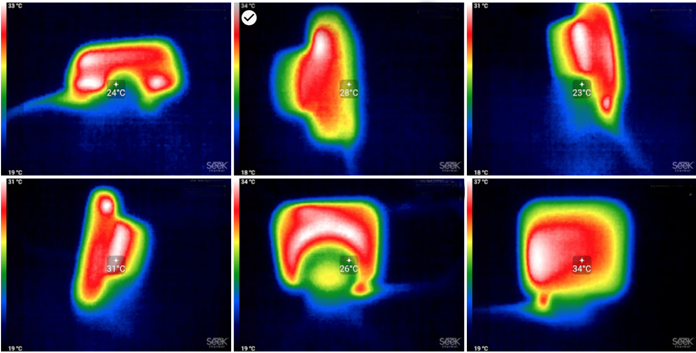 Во время длительной работы корпус аппарата естественным образом нагревается, как и любой современный прибор. Мы приводим тепловизионные снимки, сделанные после часа непрерывной видеозаписи с работающим дисплеем. Питание подавалось стационарное, тестирование проводилось в комнатных условиях при температуре окружающего воздуха около 20 °C