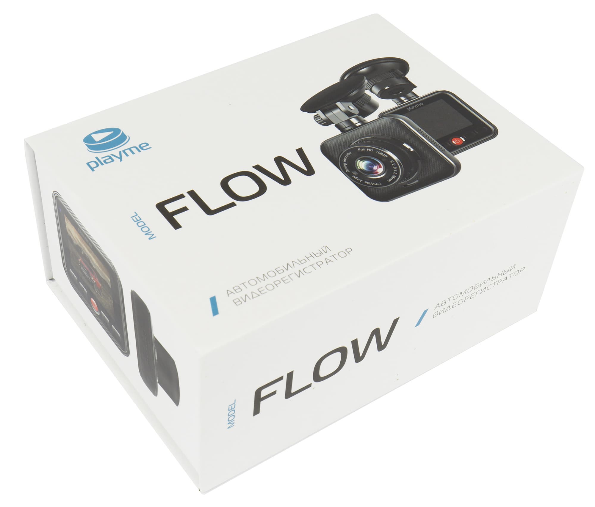 Видеорегистратор Playme Flow упакован в белую картонную коробку с полноцветной печатью. Информация на верхней и боковых сторонах лаконична: здесь есть фотографии устройства c разных сторон, логотип производителя и QR-код, ведущий на страницу модели на сайте производителя.