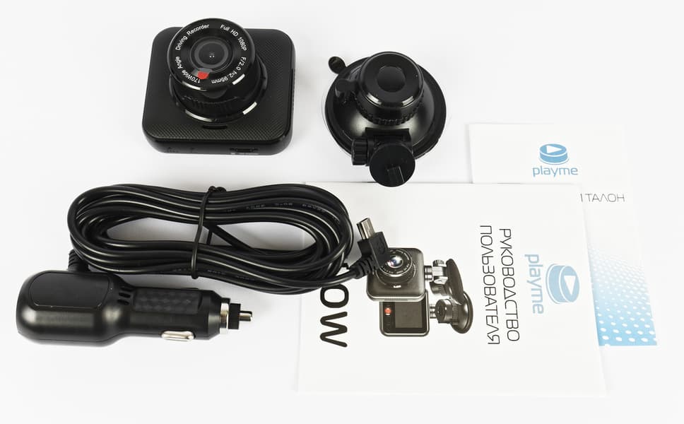Внутри коробки мы обнаружили сам регистратор, быстросъемное крепление с присоской, шнур питания с адаптером для прикуривателя, руководство пользователя и гарантийный талон.