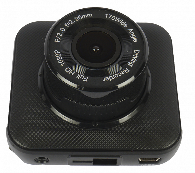 На нижней стороне располагается слот для карты microSD. Рядом с ним можно видеть отверстие микрофона и углубление, в котором спрятана кнопка сброса. На верхней грани — Т-образное отверстие быстросъемного крепления. Слева от него разъем mini-USB, обеспечивающий питание регистратора, а справа — отверстие для подключения камеры заднего вида (она не входит в комплект и приобретается отдельно).