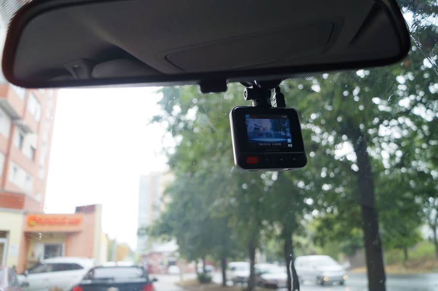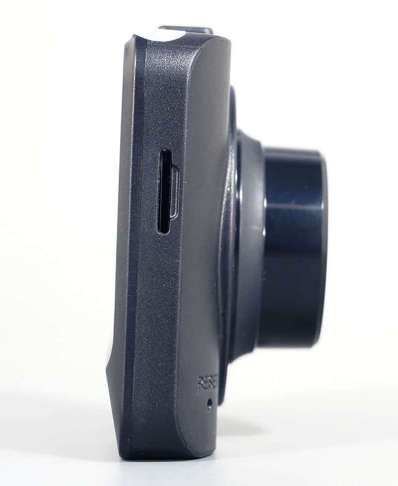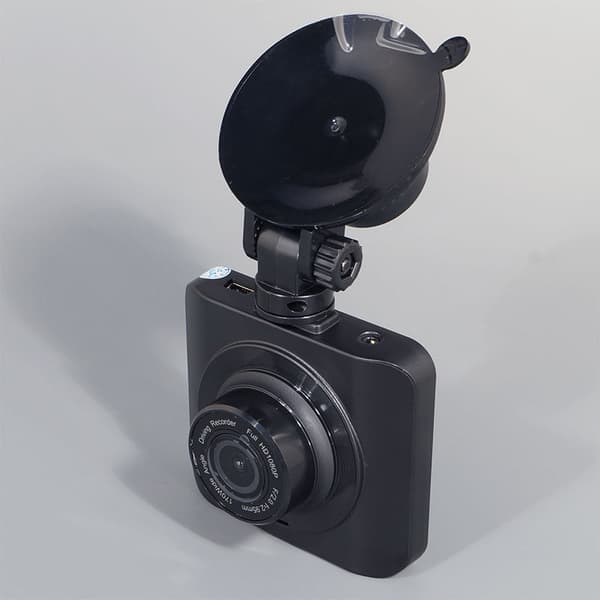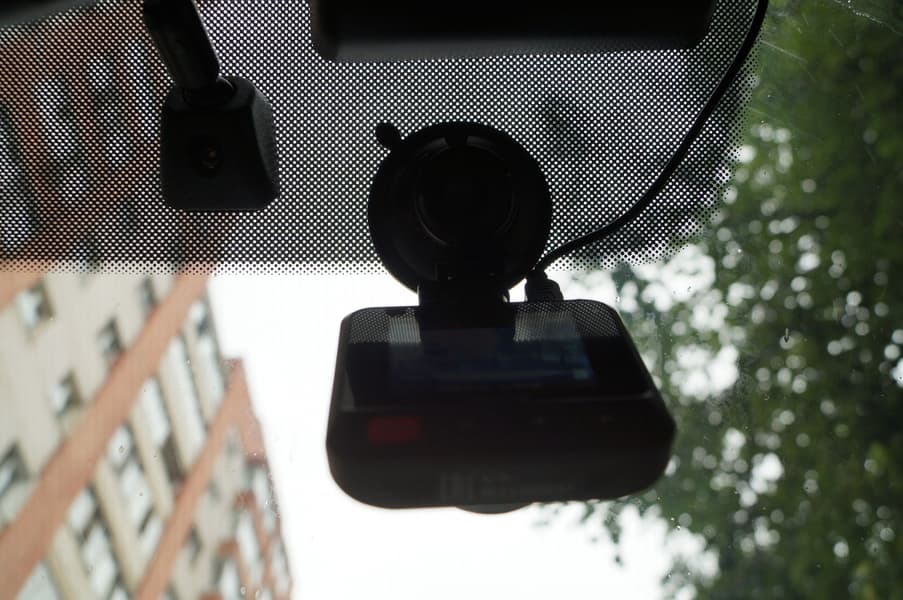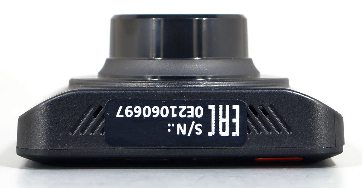 Регистратор, установленный внутри автомобиля, практически незаметен снаружи. Матовый черный корпус регистратора не дает бликов, а белый текст, напечатанный по периметру объектива, слишком мелок, чтобы «выдать» прибор.