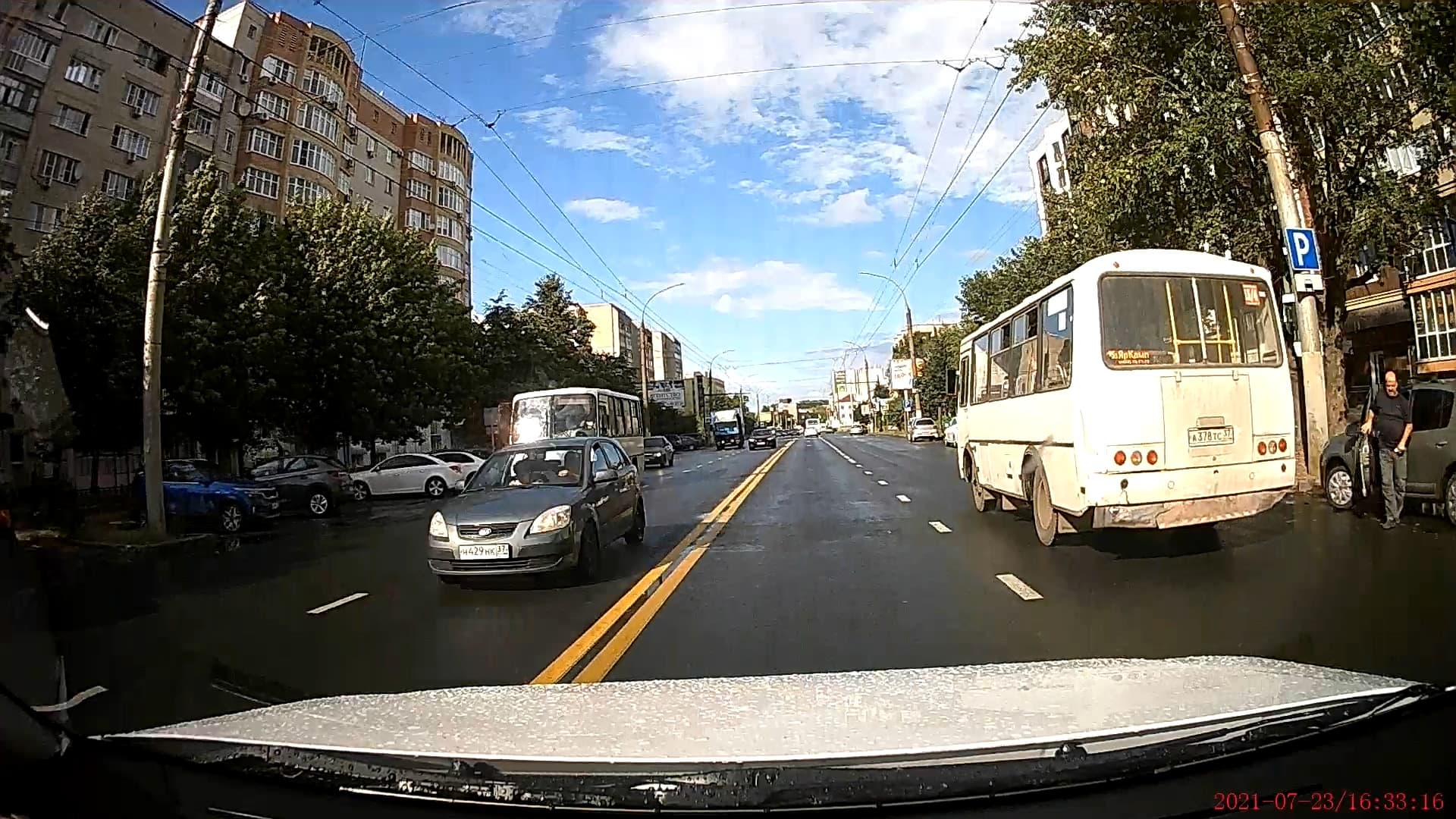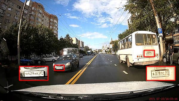 Можно видеть, что днем камера регистратора очень неплохо фиксирует мелкие детали (госномера движущихся в попутном и встречном направлении автомобилей) с расстояния 8-10 метров. Но скорость автомобиля здесь невелика, а значит, объекты движутся неспешно, такие легко поддаются фиксации.