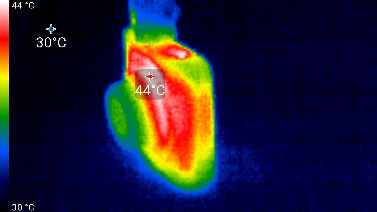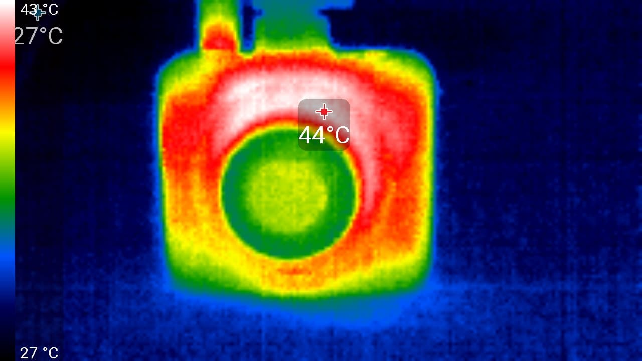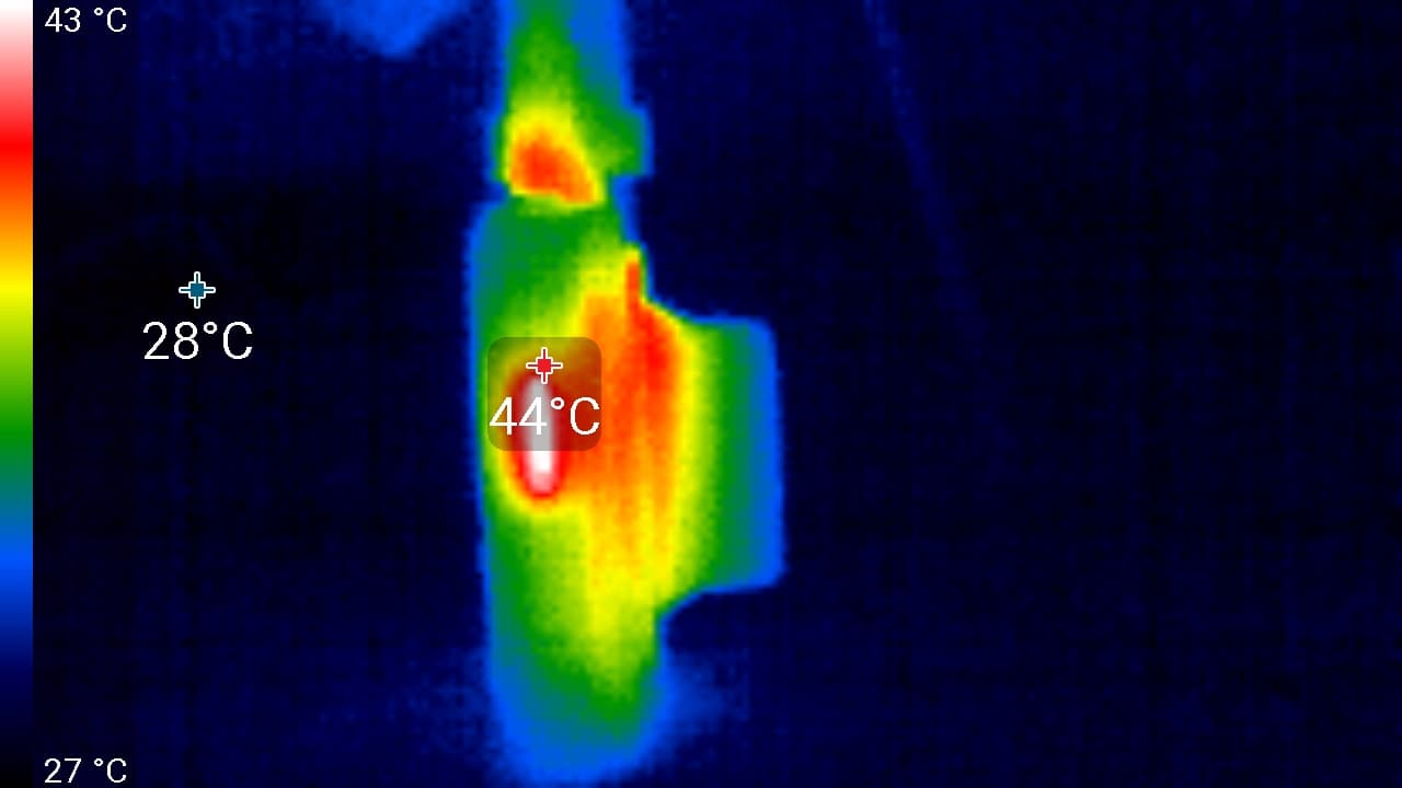 Видно, что основной нагрев происходит в районе дисплея, в левой верхней его части. Здесь температура поверхности достигает 48 °C. Такая температура не несет опасности, даже если регистратор будет подвергаться дополнительному нагреву лучами солнца. Ведь в жару автомобиль обычно охлаждается кондиционером, который направляет поток охлажденного воздуха на лобовое стекло. А значит, и на корпус регистратора.