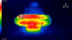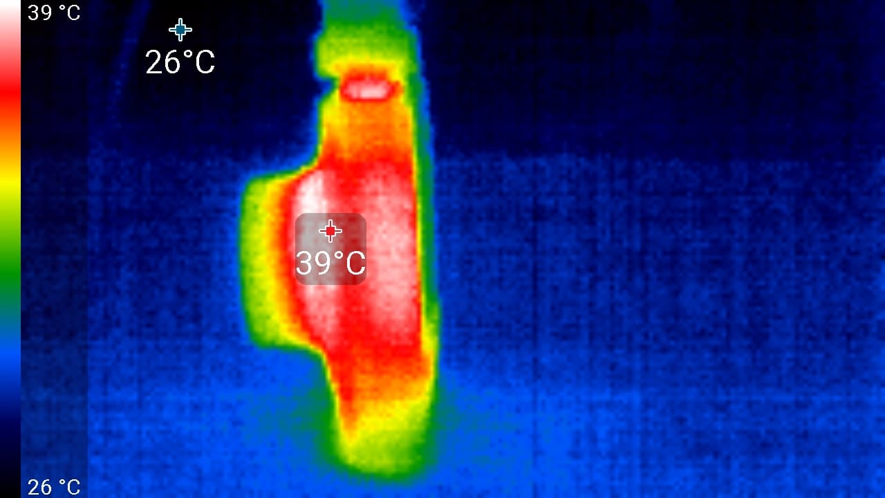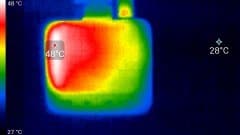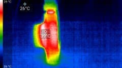 Во время длительной работы корпус аппарата естественным образом нагревается, как нагревается любой современный прибор. Ниже приводятся тепловизионные снимки регистратора, сделанные после часа беспрерывной видеозаписи с работающим дисплеем. Питание регистратору подавалось стационарное, тестирование проводилось в комнатных условиях при температуре окружающего воздуха около 27 °C