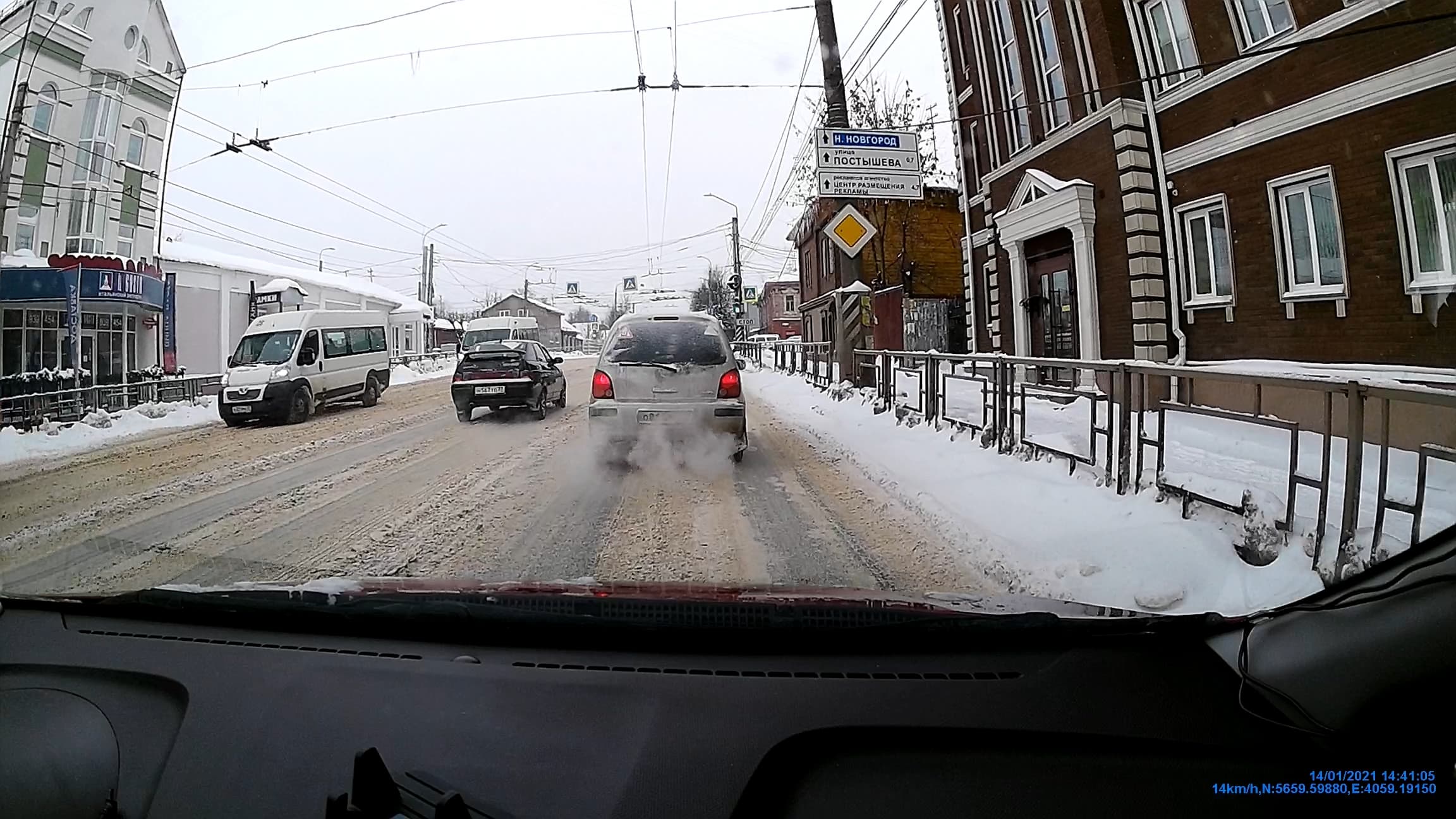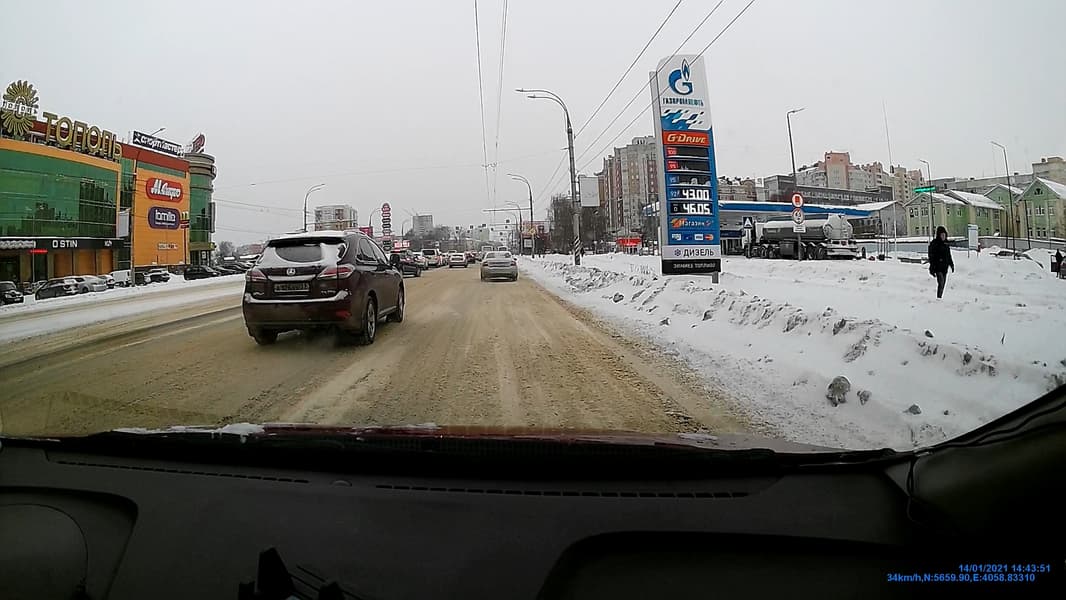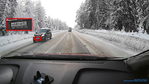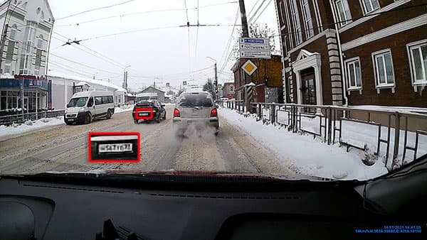 Неплохая детализация, которую дает рассматриваемый аппарат, обеспечивается его довольно аккуратным кодеком. Следующий стоп-кадр взят из видео, записанного при движении с небольшой скоростью. Можно видеть, что светлым днем камера регистратора неплохо фиксирует мелкие детали (госномер) с расстояния более 10 метров.