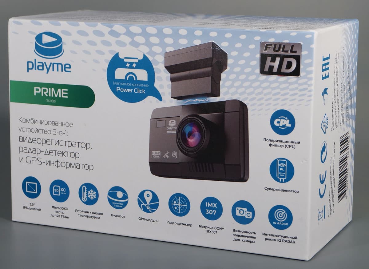 Традиционно для Playme, регистратор упакован в светлую коробку с обилием информации на ней. Из которой становится понятным не только назначение гаджета, но и почти все его характеристики и свойства.