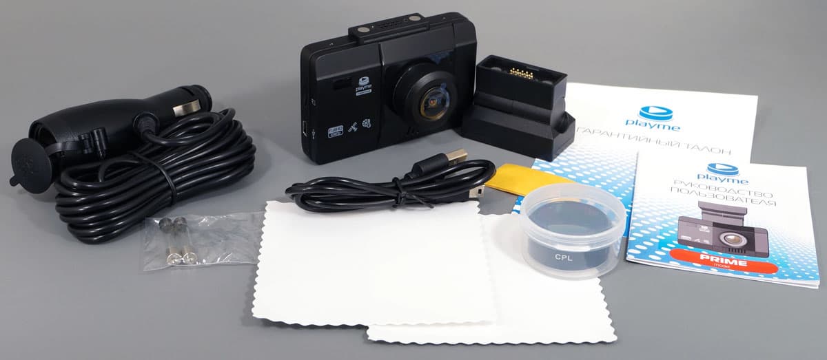 В комплекте есть все необходимое для того, чтобы тут же начать работу: регистратор с площадкой, адаптер прикуривателя с кабелем длиной 3,5 метра и двумя запасными предохранителями, короткий кабель USB, двусторонняя клейкая лента для крепления площадки к лобовому стеклу, руководство пользователя и съемный поляризационный фильтр.