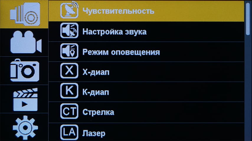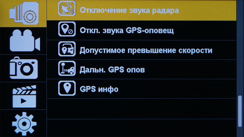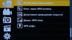 Настройки аппарата разбиты на пять категорий: настройки радар-детектора, видеонастройки, фотонастройки (кстати, а зачем регистратору уметь фотографировать?), работа с файлами на карте памяти, и, наконец, системные параметры.
