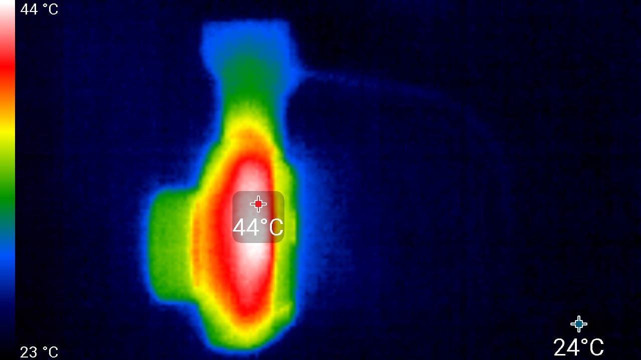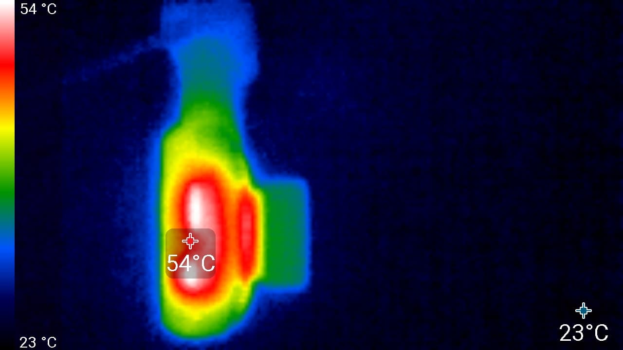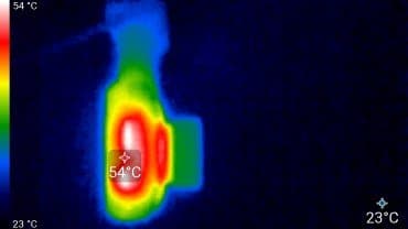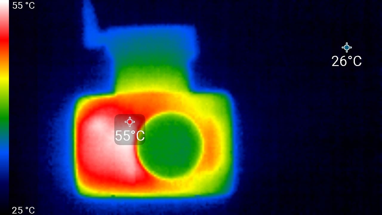 Видно, что корпус нагревается сильнее всего в области, где, по всей видимости, находится процессор. Здесь температура достигла 55 °C. Такая температура близка к опасному порогу, а летнее солнце может еще более увеличить нагрев. Но в жару автомобиль обычно охлаждается кондиционером, причем поток охлажденного воздуха направлен на лобовое стекло, а значит, охлаждает регистратор.