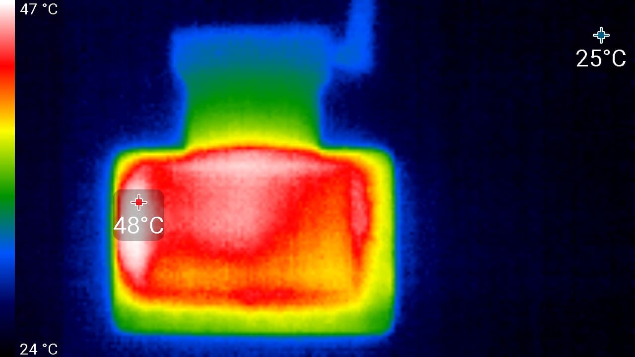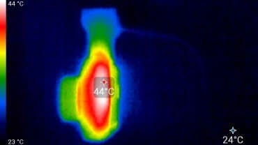 Во время длительной работы некоторые участки корпуса аппарата серьезно нагреваются. Ниже приведены тепловизионные снимки прибора, сделанные после часа беспрерывной видеозаписи с работающим дисплеем. Питание регистратору подавалось стационарное, тестирование проводилось в комнатных условиях при температуре окружающего воздуха около 26 °C.