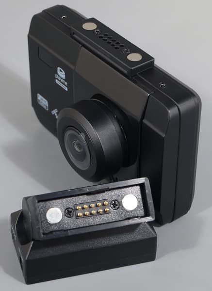 Модуль-площадка снабжен контактами, через которые на регистратор подается питание и производится обмен информацией. Этот крепежный элемент имеет петлю-шарнир, что позволяет изменить наклон регистратора. Усилие, с которым производится наклон, довольно велико — кажется, что магниты вот-вот не выдержат и регистратор оторвется от площадки. Надеемся, такой тугой ход петли обеспечит долговечную работу соединения.