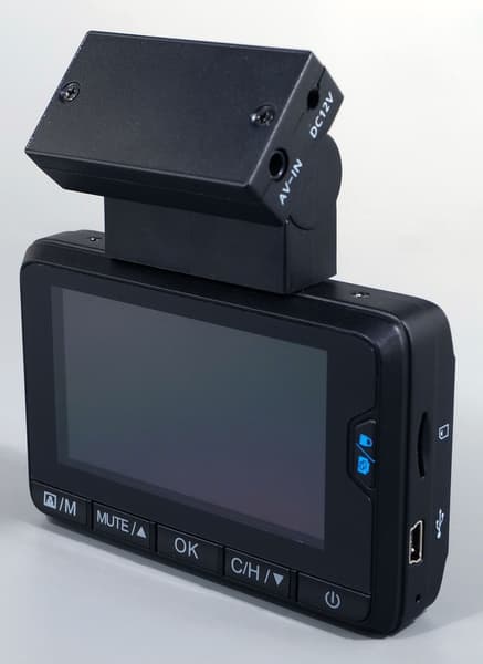 Под крупным дисплеем расположен ряд кнопок, с помощью которых осуществляется управление прибором. Справа от дисплея — еще одна кнопка. Ее назначение — блокировка текущего видеоролика от стирания, а также переключение сигнала, отображаемого на дисплее, с сигнала основной камеры на сигнал дополнительной (задней).