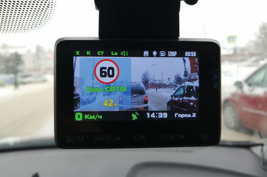 Дисплей, помимо видеопотока, отображает множество дополнительной информации: текущий режим работы, формат записи, текущее время и скорость, а также наличие помех по пути следования. Под помехами здесь понимаются камеры, радары и прочие ловушки, призванные воспитать водителя.