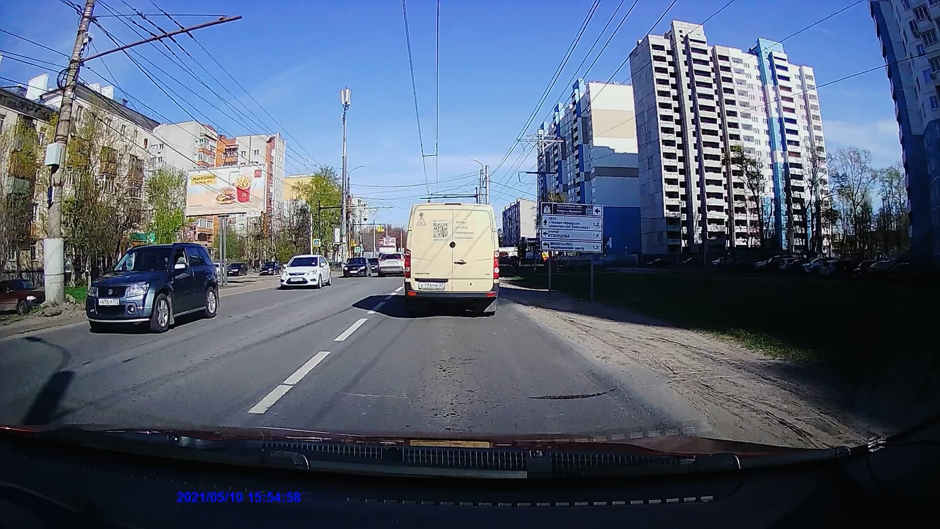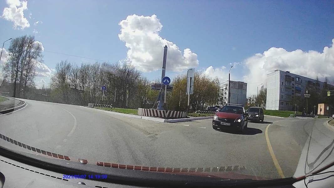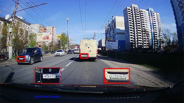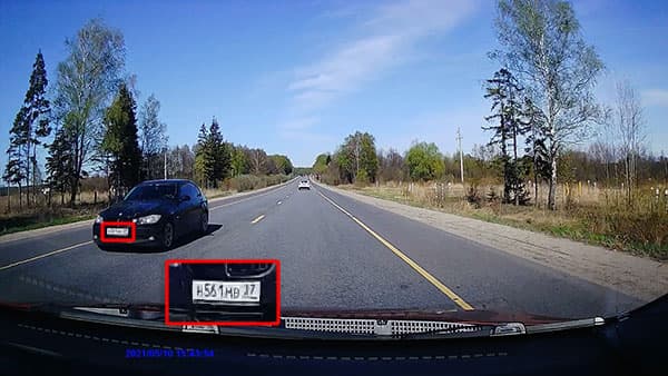 Следующий стоп-кадр взят из видео, записанного при движении с небольшой скоростью. Встречный и попутный автомобили находятся примерно на одном расстоянии от регистратора, метрах в десяти. Их регистрационные номера различить непросто, но возможно. Имеющиеся искажения — это «заслуга» кодека, который довольно небрежно фиксирует мелкие контрастные детали.