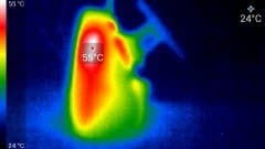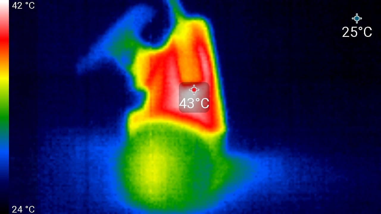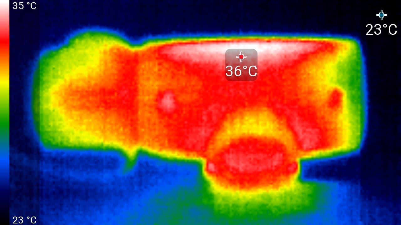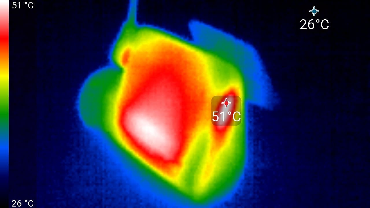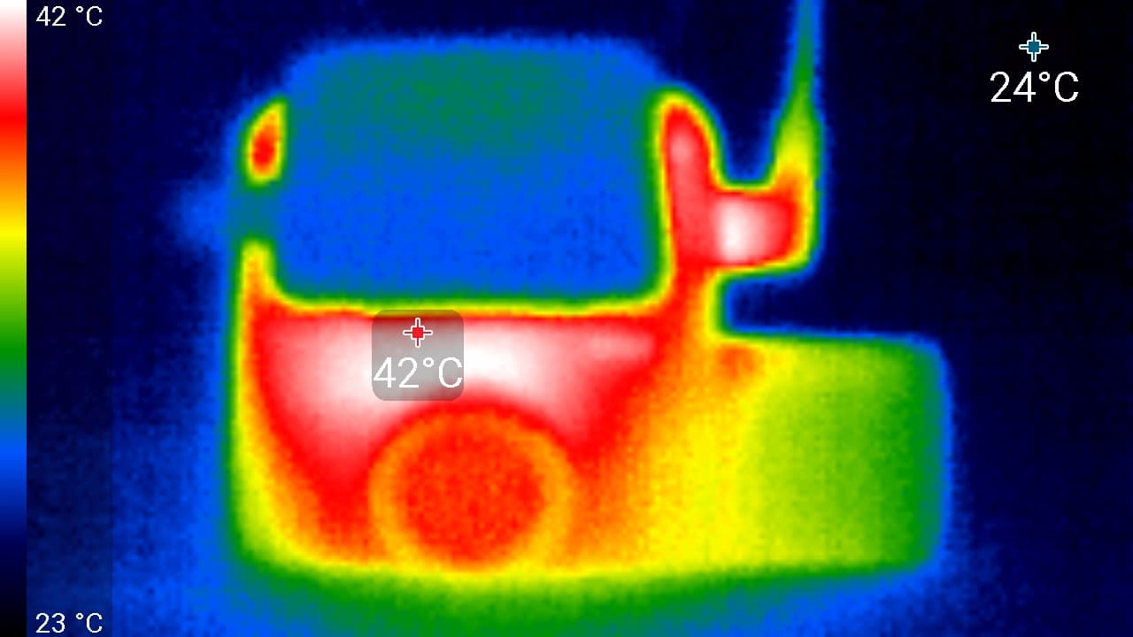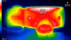 Во время длительной работы корпус аппарата ощутимо нагревается. Ниже приведены тепловизионные снимки прибора, сделанные после часа беспрерывной видеозаписи с работающим дисплеем. Питание регистратору подавалось стационарное, тестирование проводилось в комнатных условиях при температуре окружающего воздуха около 25 °C.