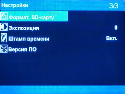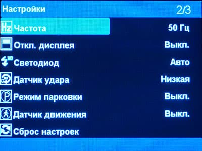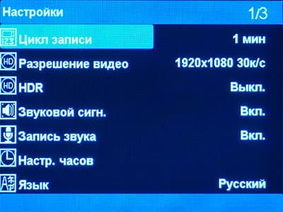 Настройки аппарата не разбиты на категории, все параметры находятся в единственном разделе, состоящем из трех страниц. Настройки скромны, и это, как мы уже не раз отмечали — только в плюс. Регистратор должен отвечать правилу «включил и забыл». Пользователь не обязан возиться с десятками настроек всяких экспозиций и заучивать другие страшные для обывателя словечки.