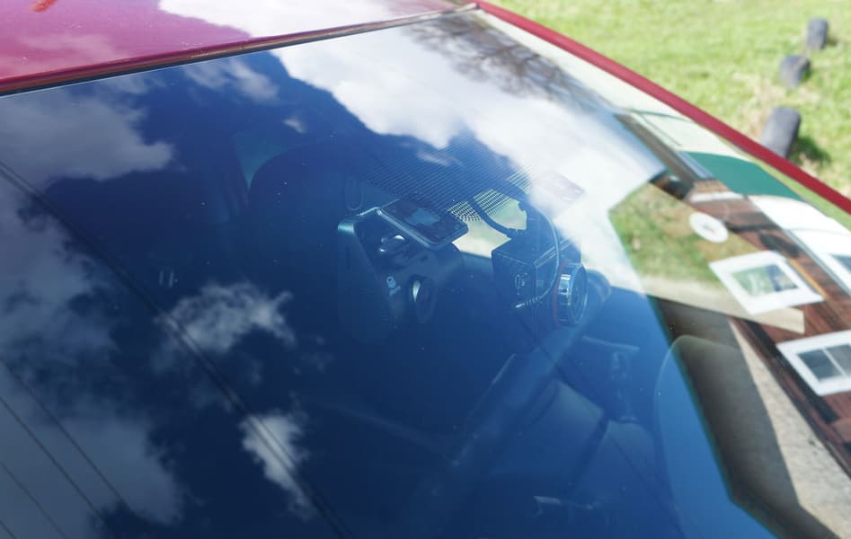 Мы закрепили регистратор справа от зеркала, поскольку место под зеркалом давным-давно занято неснимаемым «штатным» регистратором, капитально установленным еще в сервисе автодилера. Кстати, визуальное сравнение работающих регистраторов пошло совсем не на пользу старому устройству, экран которого оказался значительно тусклее, чем дисплей современного регика. Пусть он и крупнее (все-таки это был регистратор почти премиум-класса), но, увы, тусклый.