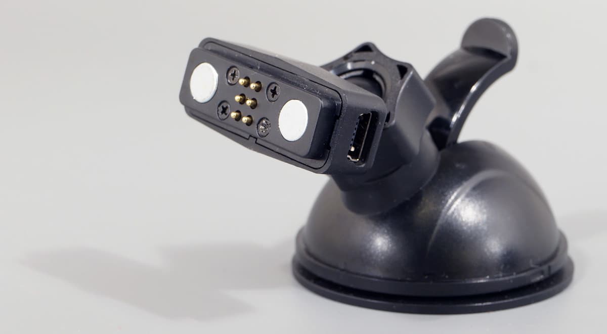 Стандартное крепление-присоска оканчивается фирменной площадкой с контактами и двумя магнитами. Это такие же магниты, как и в площадке корпуса регистратора. Их поля разнонаправлены, благодаря чему регистратор нельзя примагнитить неправильной стороной, объективом в сторону салона.