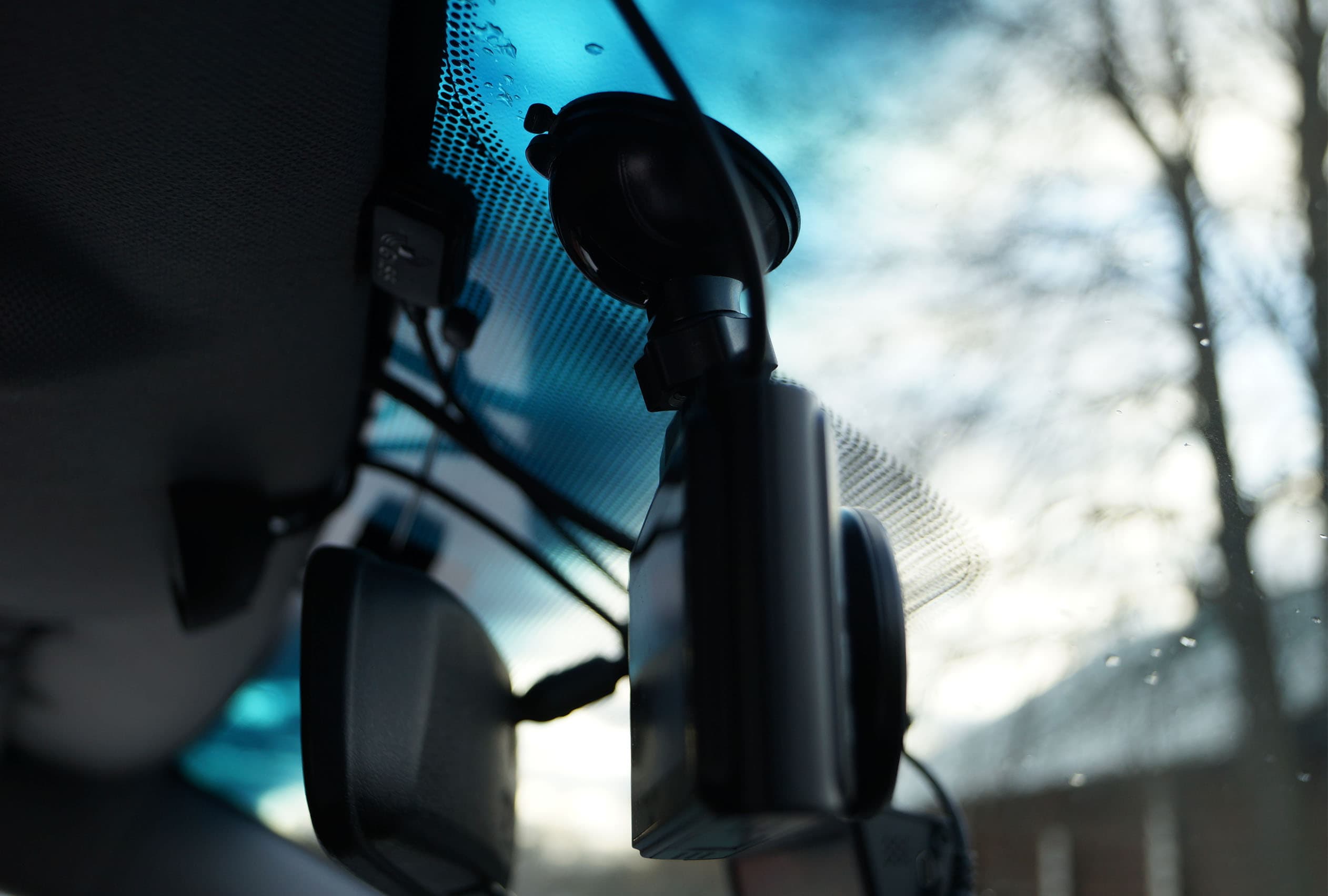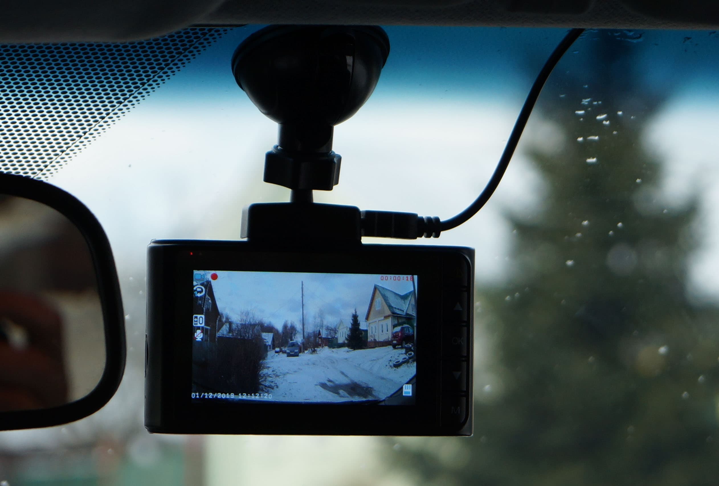 При установке регистратора в автомобиле следует учитывать габариты всей конструкции в сборе: 11-12 сантиметров от верхнего торца присоски до нижнего края корпуса регистратора. Такая высота означает, что в автомобилях типа седан с невысокими лобовыми стеклами регистратор будет закрывать обзор, даже если присоска закреплена максимально высоко. На следующих фото видно, что регистратор, установленный слева от зеркала заднего вида (как того требует логика), оказался даже ниже штатного зеркала, и в результате перекрыл собой одну из главных зон внимания водителя, в которую попадают дорожные знаки и указатели, установленные над дорогой.