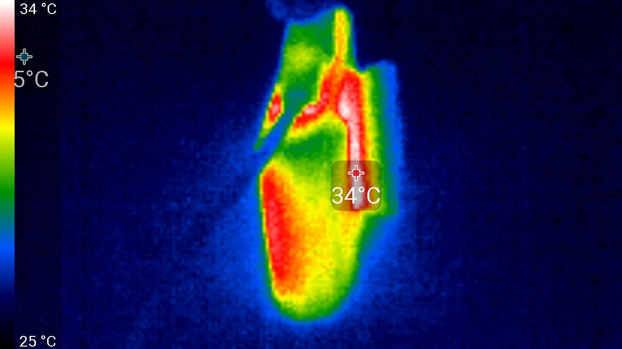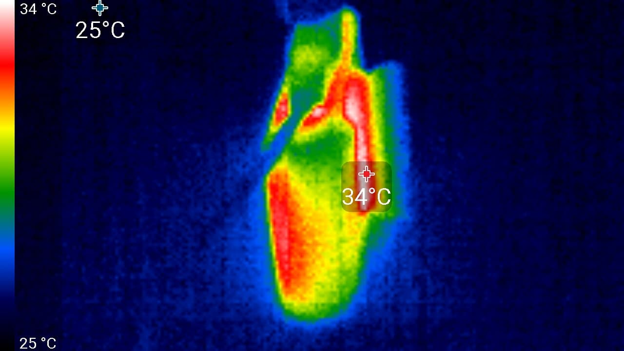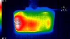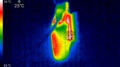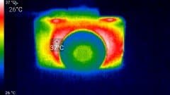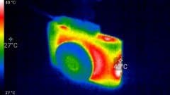 Во время длительной работы корпус аппарата нагревается незначительно. Ниже приведены тепловизионные снимки прибора, сделанные после часа беспрерывной видеозаписи с работающим дисплеем. Тестирование проводилось в комнатных условиях при температуре окружающего воздуха около 25 °C.