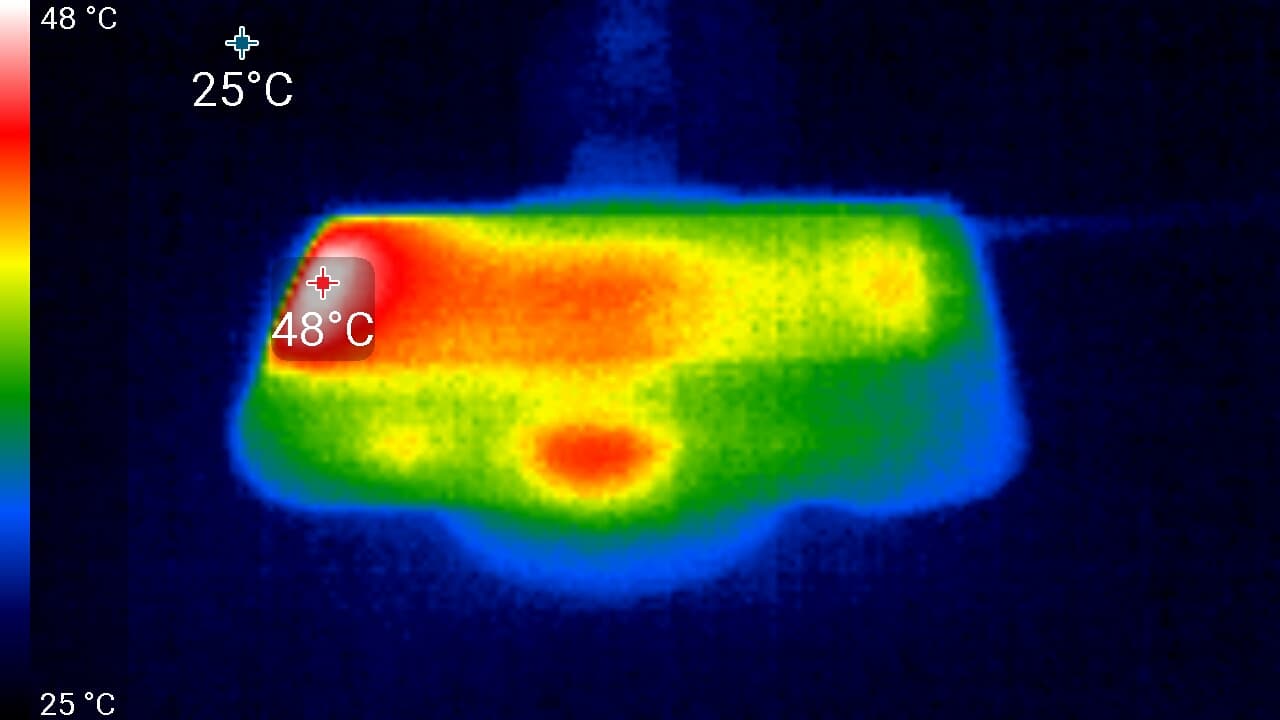Видно, что корпус нагревается сильнее всего в области экрана, в левой его части. Здесь температура достигла 48 °C. Кстати, может быть, это и случайность, но именно здесь расположен слот карты памяти. Как бы то ни было, температуры до 50-55 °C не представляют для электроники серьезной опасности.