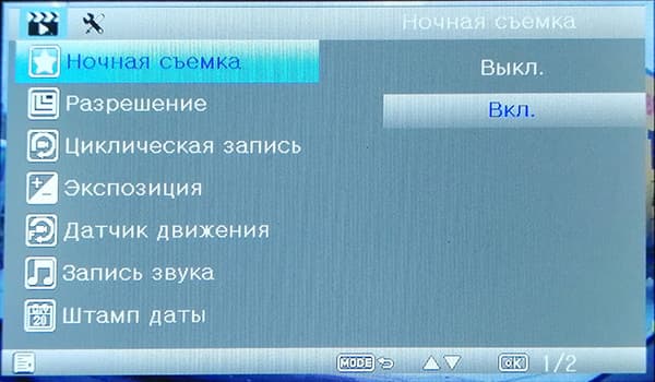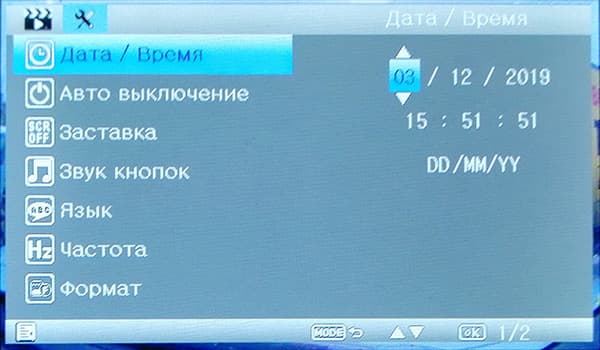 Меню настроек регистратора состоит из двух разделов, навигация по меню производится с помощью кнопок. Как видим, изменяемых параметров здесь совсем немного, это обусловлено крайней простотой гаджета, которую мы уже отмечали. Отметим необходимость ручной установки даты и времени, за актуальностью которых нужно следить, время от времени сравнивая с текущим временем на смартфоне, к примеру.