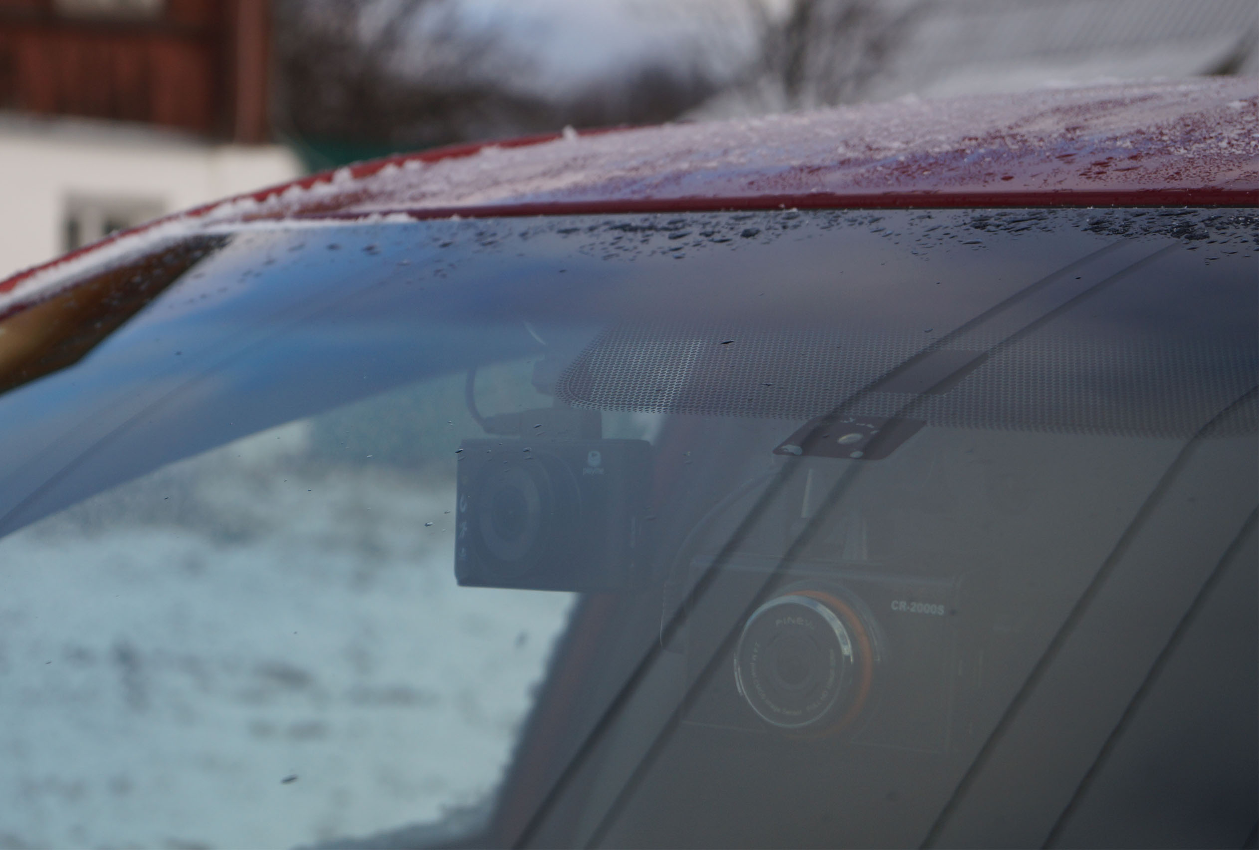 Установленный прибор довольно заметен при взгляде снаружи. Его выдает большой объектив и белые надписи на корпусе. На фотографиях можно оценить заметность регистратора, а также сравнить ее с заметностью еще более вычурного «родного» регистратора, который был установлен в автомобиле ранее.