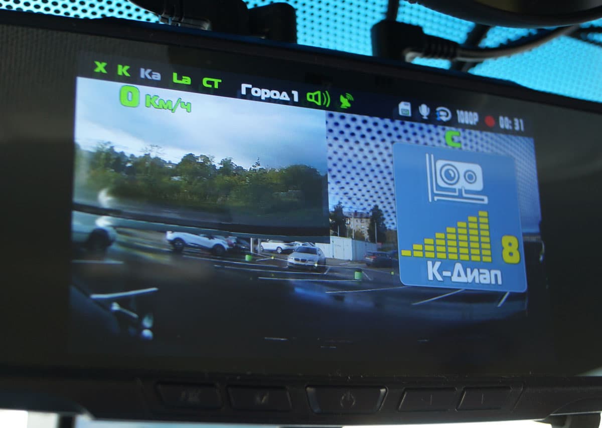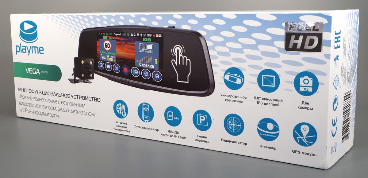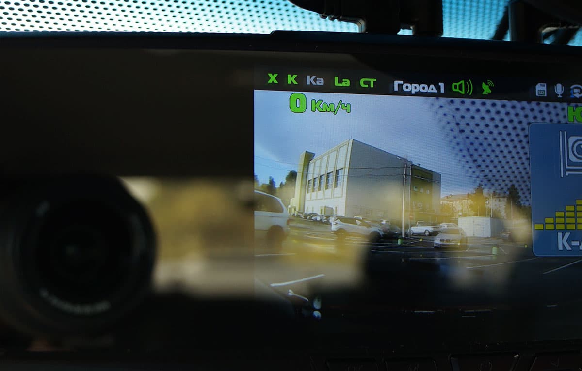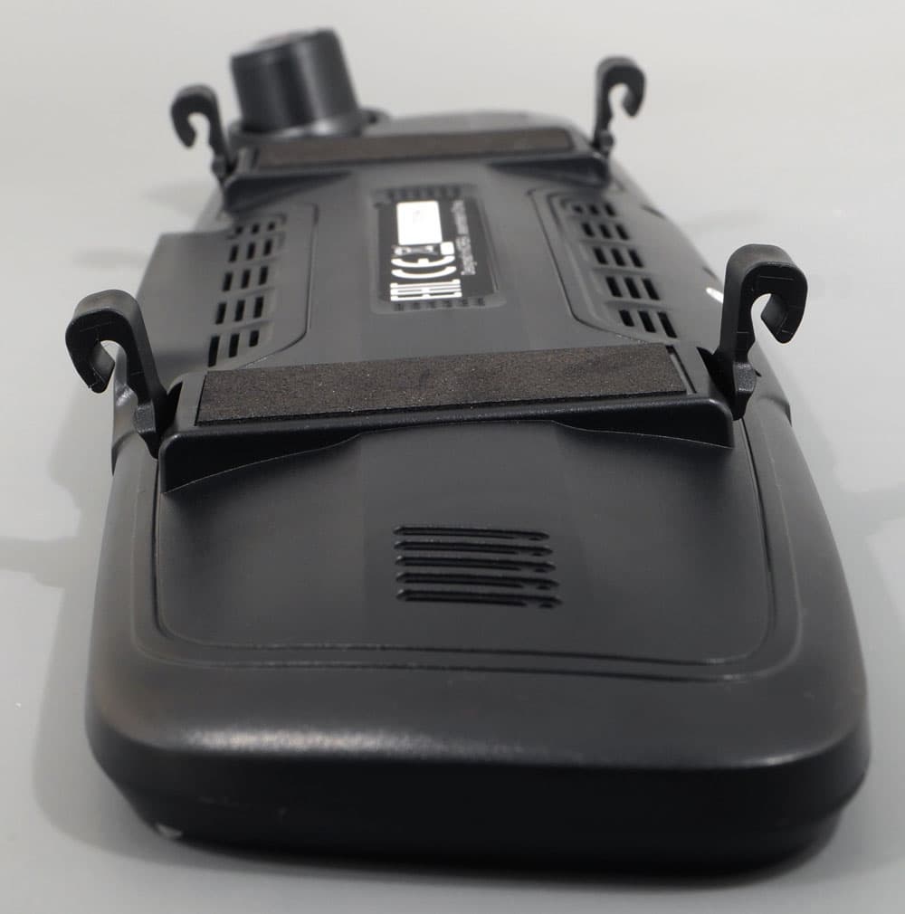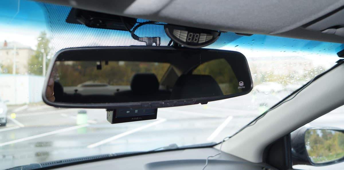 В наш же аппарат «впихнули» сразу несколько функций. Это, ни много ни мало, зеркало заднего вида с двухкамерным регистратором, сенсорным дисплеем и встроенным-радар детектором и GPS-информатором.